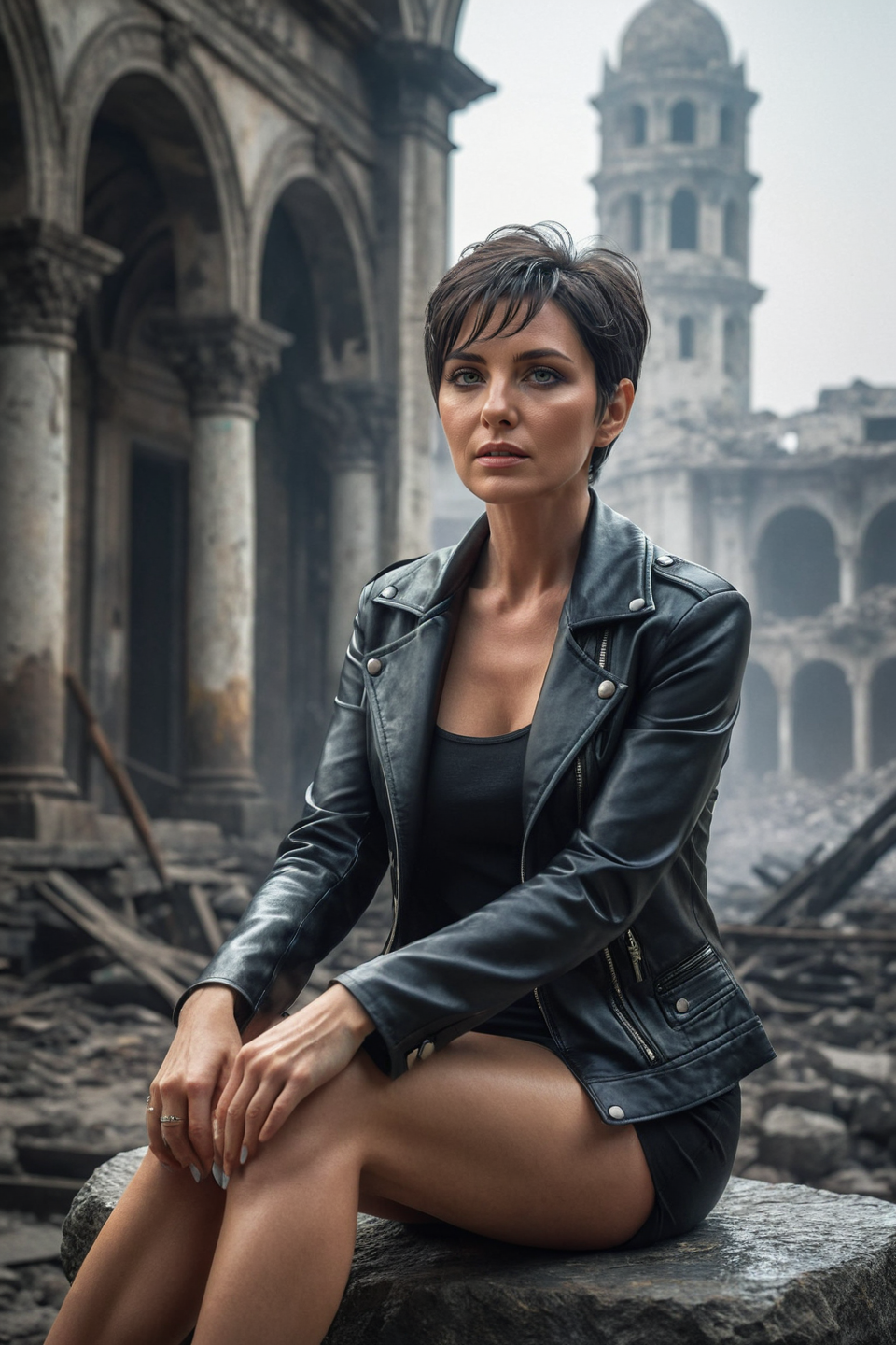 (solo, full body photo:1.3), (action packed:1.3), (haze, fog, mist:1.3), chiaroscuro, <lora:DDR_Fashion:0.3>, AnalogRedmAF <lora:AnalogRedmondV2-Analog-AnalogRedmAF:0.1> futuristic, perfect nails, perfect hands, realistic reflection, realistic caustics, (RAW photo:1.2), (photorealistic:1.4), (masterpiece:1.3), (intricate details:1.2), delicate, (head_scale:0.8, chin is up), beautiful detailed, (detailed eyes), (detailed facial features) looking at the viewer with sparkling eyes, 8k MILF, old woman, mature woman, ultradetailed, unhappy, (solo, full body photo:1.1), short-cut, (pixie-cut:1.3), (black hair:1.3), short hair, ((full body shot, sitting on a stone)), ruins everywhere, <lora:add-detail-xl:1> <lora:DetailedEyes_V3:1>, perfect eyes <lora:perfect-eyes:0.3>