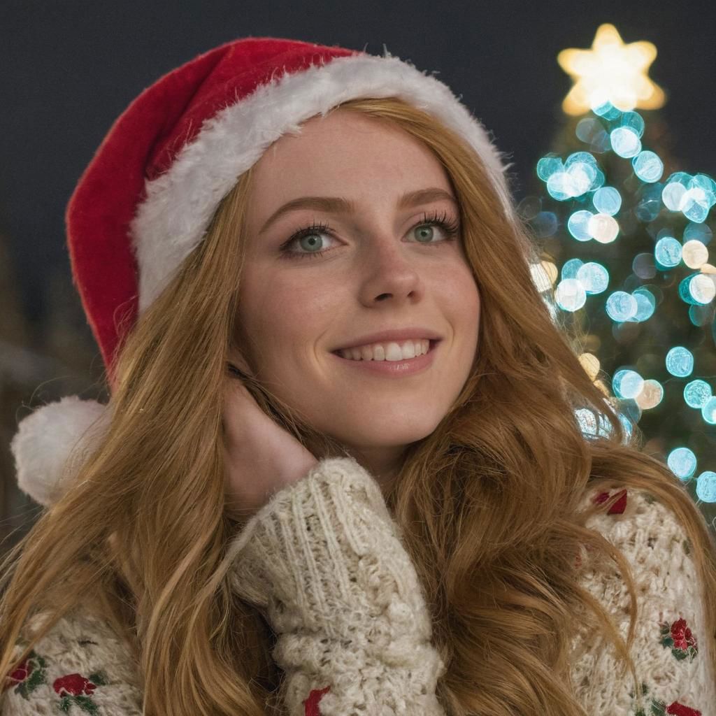 side view, looking out of frame, a gorgeous 21 y.o woman, green eyes, strawberry blonde hair, long straight hair, happy, cheery, wearing a christmas sweater, wearing a christmas hat, (looking at a giant christmas tree:1.5), on a big city square, at night, snow, natural skin, skin moles, skin pores, goosebumps, high detailed, (cinematic, film grain:1.1)