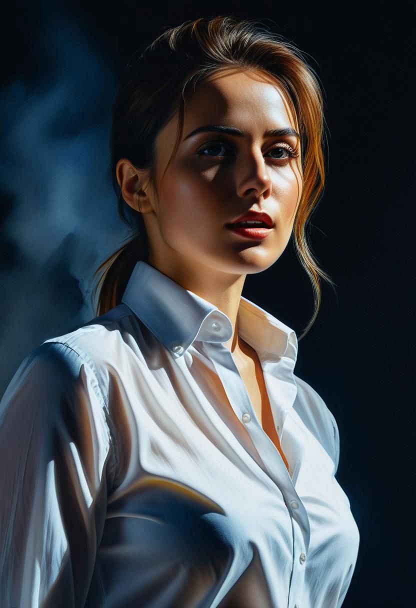 close-up, 8k, HDR, RGB, oil paint, watercolor, masterpiece, 8k, raw, ultra-realistic, woman in white high collar shirt, high quality, masterpiece, portrait, fashion show, captured in the middle of a splash, action pose suggesting movement, chiaroscuro play of light and shadow, luminism, engraving, uniqueness, creating a photorealistic and crazy impression, professional level, digital art, soft natural volumetric cinematic perfect light. Interaction of light and shadow, Greg Rutkowski, Maria Sibylla, Merian Style, Studio Ghibli Genshin Impact