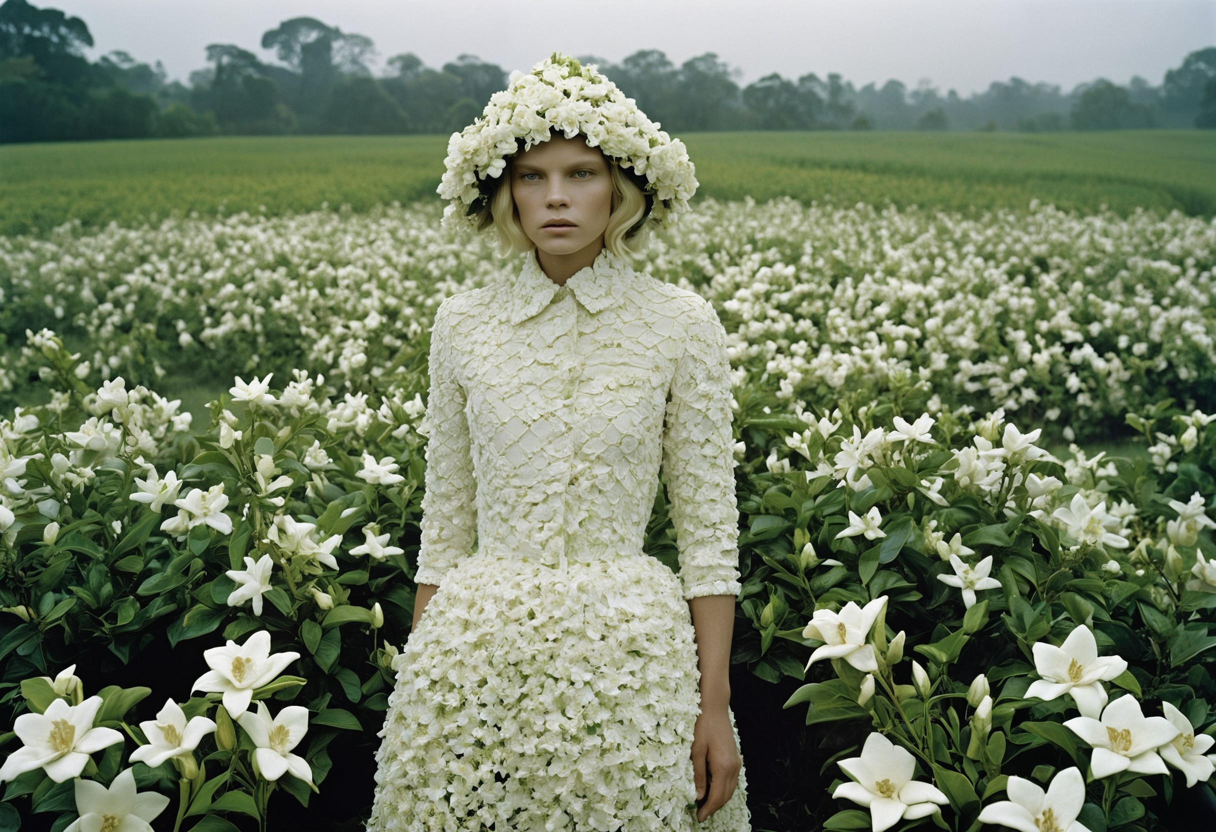 planted with smooth pattern clothing Jasmine and gardenia flower in a scene of where the wild things are gardenia field : portrait photography by tim walker , surreal