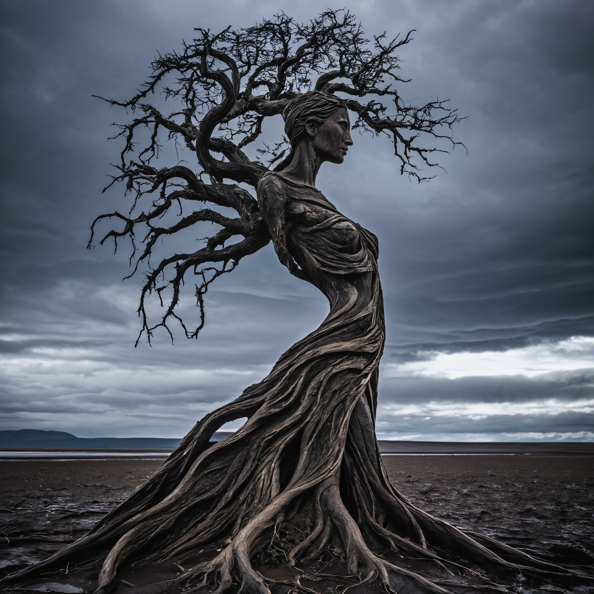 A solitary figure of resilience, mother nature, carved from the very earth, enduring the wrath of nature's fury.