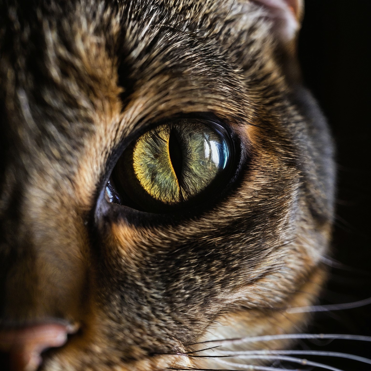 Photo of a cat's eye, intensely illuminated, capturing the intricate details of its iris and fur. The rest of the feline's face is hidden in shadows, creating a sense of intrigue and curiosity