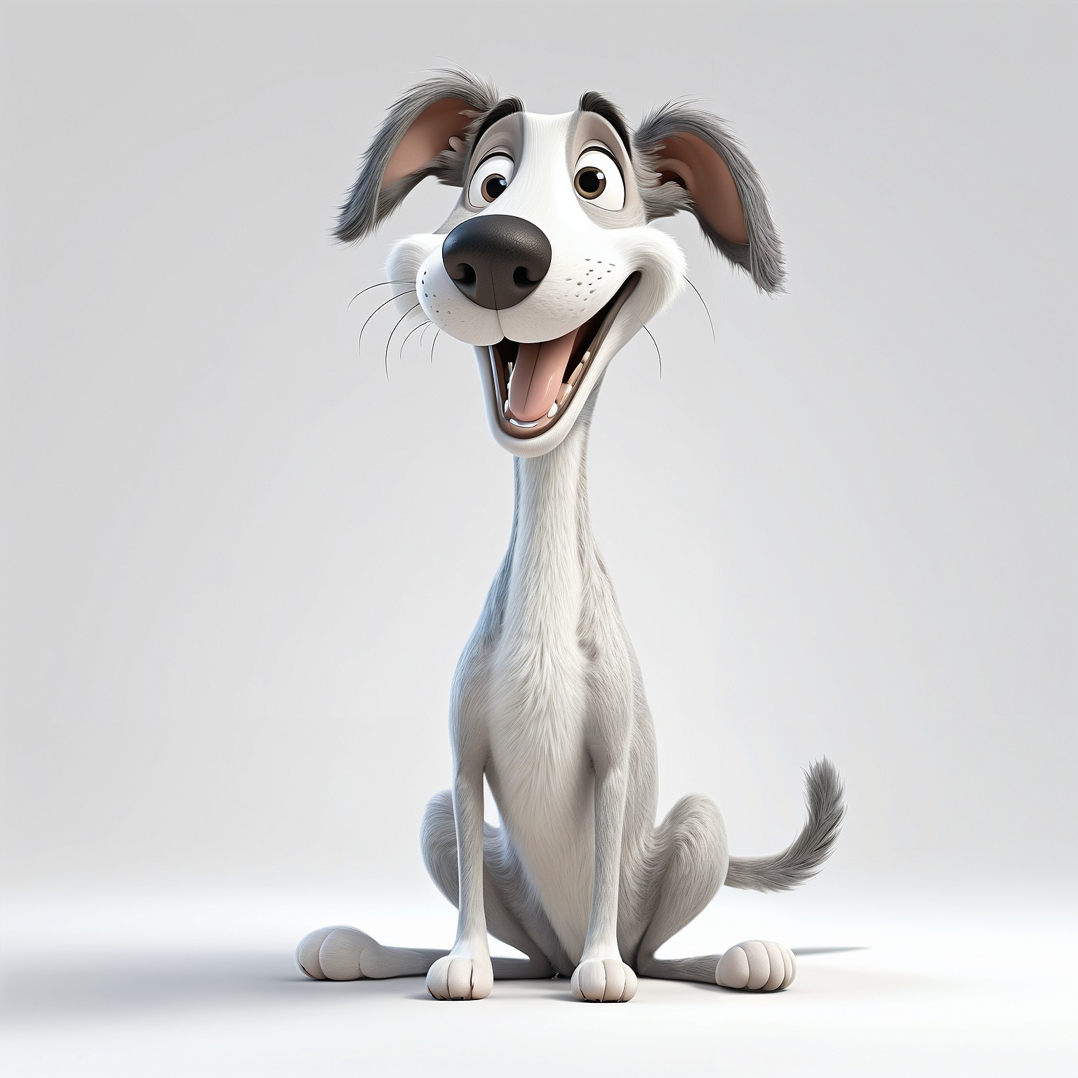 hubby cute fluffy the little greyhound's belly, funny facial expressions, exaggerated movements, 3D characters, white background, a bit fluffy, elongated shapes, cartoon style, minimalist