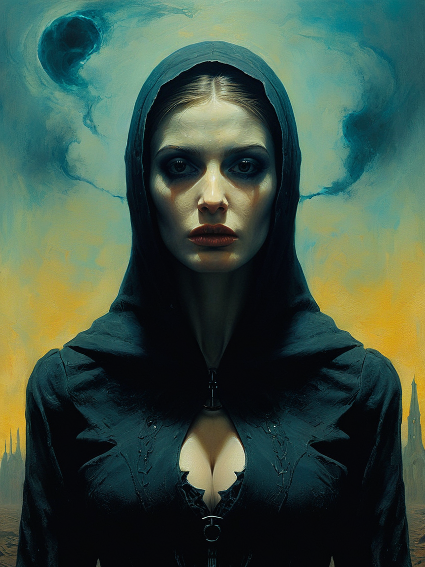 medium shot, portrait painting , dystopian surrealism, Gothic Dystopian Future ,nightmarish, facing camera, fayereagan woman, dynamic pose, in a "Zdzislaw beksinski" style painting <lora:FayeReagan_SDXL_v1.0:1>