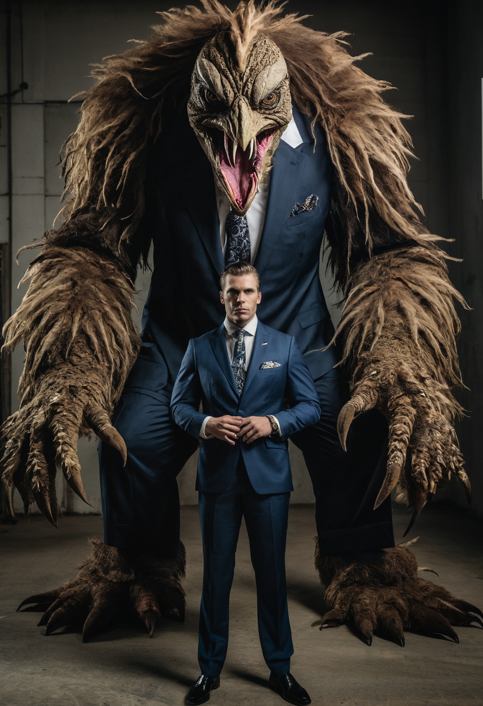 raw photo featuring a man in a suit next to an enormous monster, in the style of fashion photography, avian-themed, elegant, emotive faces, national geographic photo, furry art, photo taken with nikon d750, twisted characters