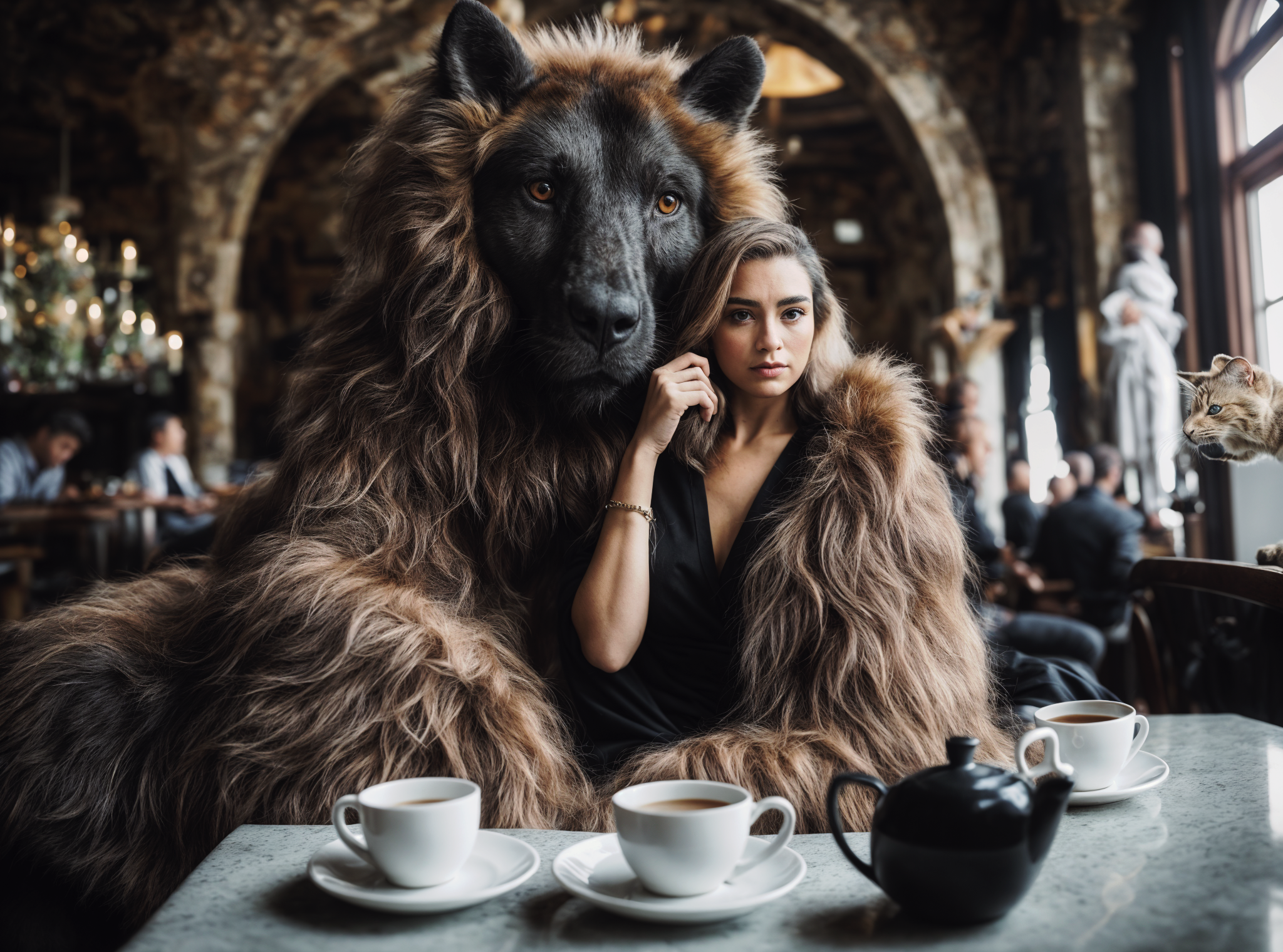 woman standing behind a large furry creature and a cup of coffee, in the style of fashion photography, made of rubber, matte photo, elegant, emotive faces, national geographic photo, eye-catching composition, caricature-like