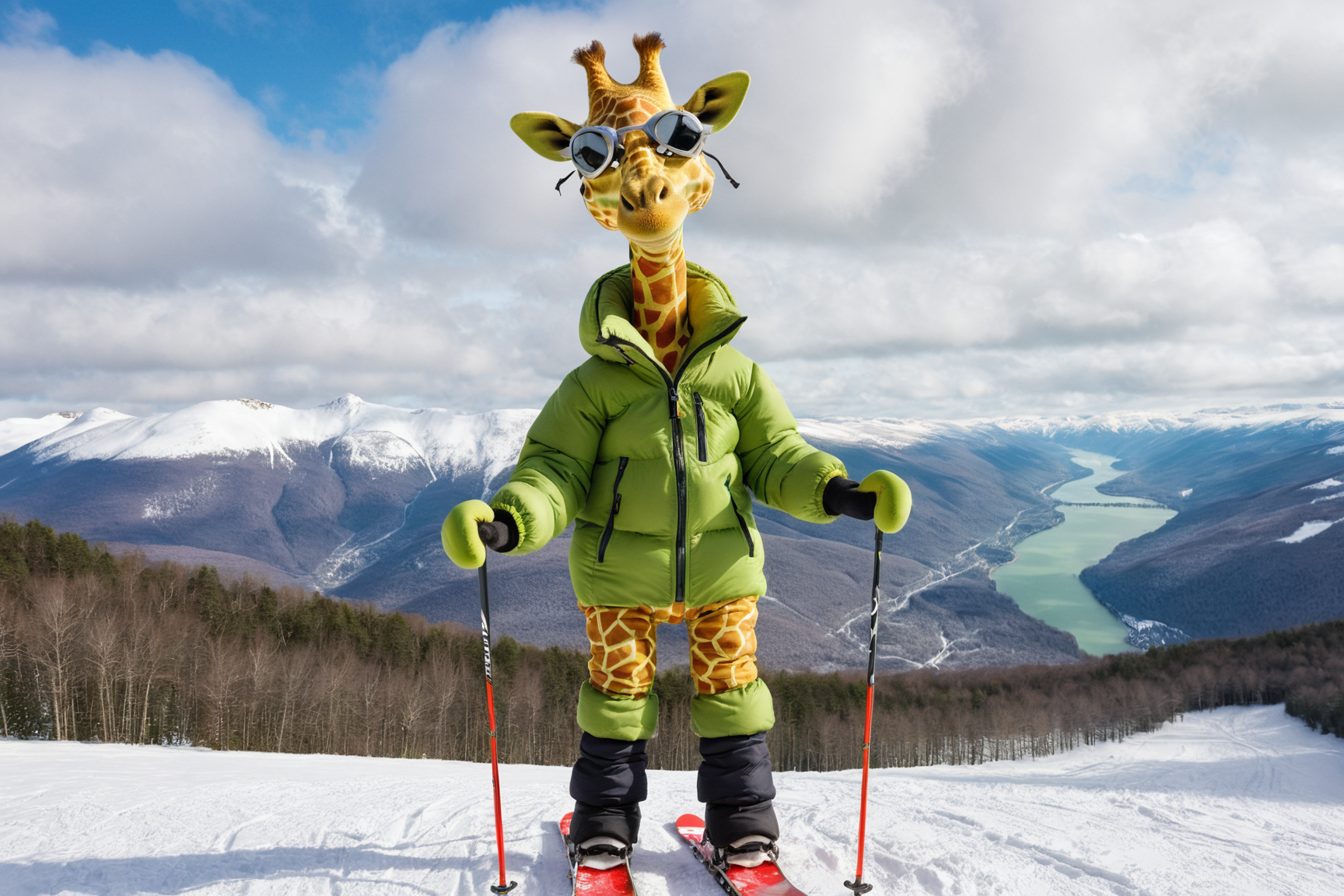 Anthropomorphic small green giraffe, wearing a thick down jacket, skiing in the cold winter, lovely appearance, in nordic mountains,<lora:EMS-37230-EMS:0.600000>