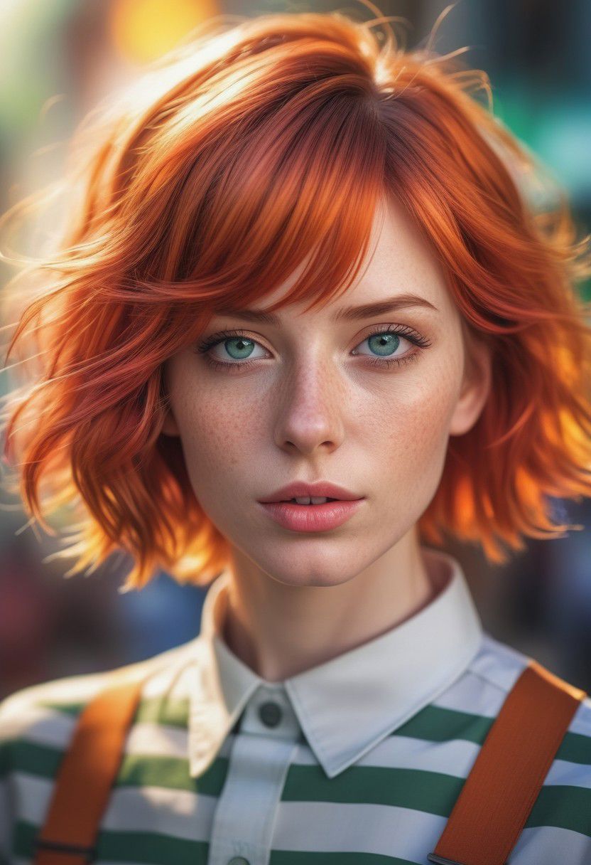 (best quality, masterpiece, beautiful and aesthetic:1.2, colorful, dynamic angle)((Full shot)), (highly detailed illustration), science fiction, extreme detailed, colorful,35mm, bokeh, 9:16, (intricate details, hyperdetailed:1.15), detailed, sunlight passing through hair (high contrast, official art, extreme detailed, highest detailed), <lora:Leeloo_5thElement_MillaJovovich_smf_lora_v2:0.9>, 1girl, l3e1o057h-smf, solo, realistic, shirt, blue eyes, looking at viewer, lips, red hair, parted lips, short hair, upper body, striped shirt, white shirt, suspenders, short sleeves, blurry, nose, bangs, orange hair, indoors, blunt bangs, green eyes, blurry background, portrait <lora:add_detail:0.5>