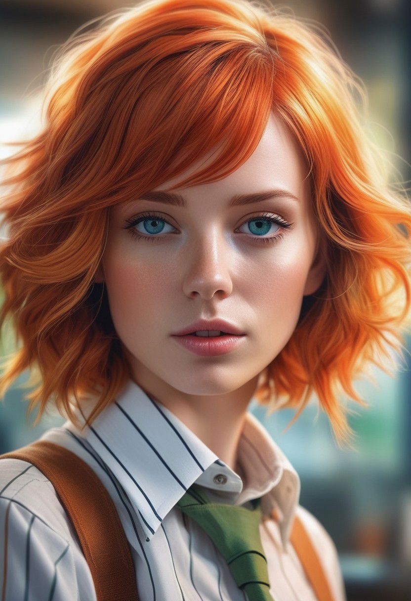 (best quality, masterpiece, beautiful and aesthetic:1.2, colorful, dynamic angle)((Full shot)), (highly detailed illustration), science fiction, extreme detailed, colorful,35mm, bokeh, 9:16, (intricate details, hyperdetailed:1.15), detailed, sunlight passing through hair (high contrast, official art, extreme detailed, highest detailed), <lora:Leeloo_5thElement_MillaJovovich_smf_lora_v2:0.9>, 1girl, l3e1o057h-smf, solo, realistic, shirt, blue eyes, looking at viewer, lips, red hair, parted lips, short hair, upper body, striped shirt, white shirt, suspenders, short sleeves, blurry, nose, bangs, orange hair, indoors, blunt bangs, green eyes, blurry background, portrait <lora:add_detail:0.5>