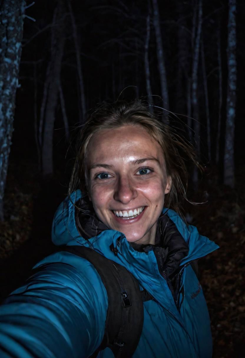 girl at night in the wood, selfie, dressed for trekking, winter, laughing, at night, very dark, infrared photography, without flash, grainy, ((motion blur)), blurry, walking