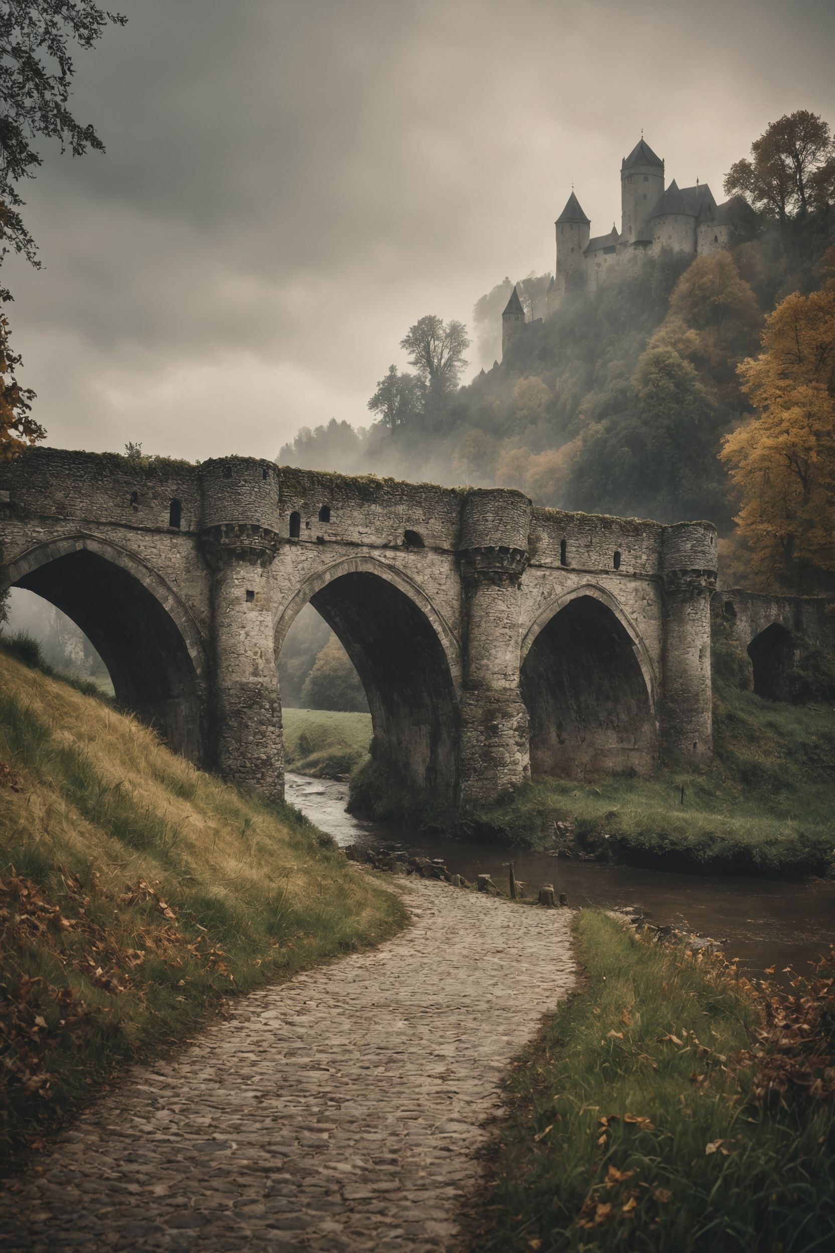 cinematic film still (historical medieval tapestry:1.2) of a antique scene, medieval antique germany, bridge, landscape, autumn noon, (mist:1.2), heavy rain, raw photo, sharp focus, wide angle lens, scenic, shallow depth of field, vignette, highly detailed, high budget Hollywood film, bokeh, cinemascope, moody, epic, gorgeous, film grain