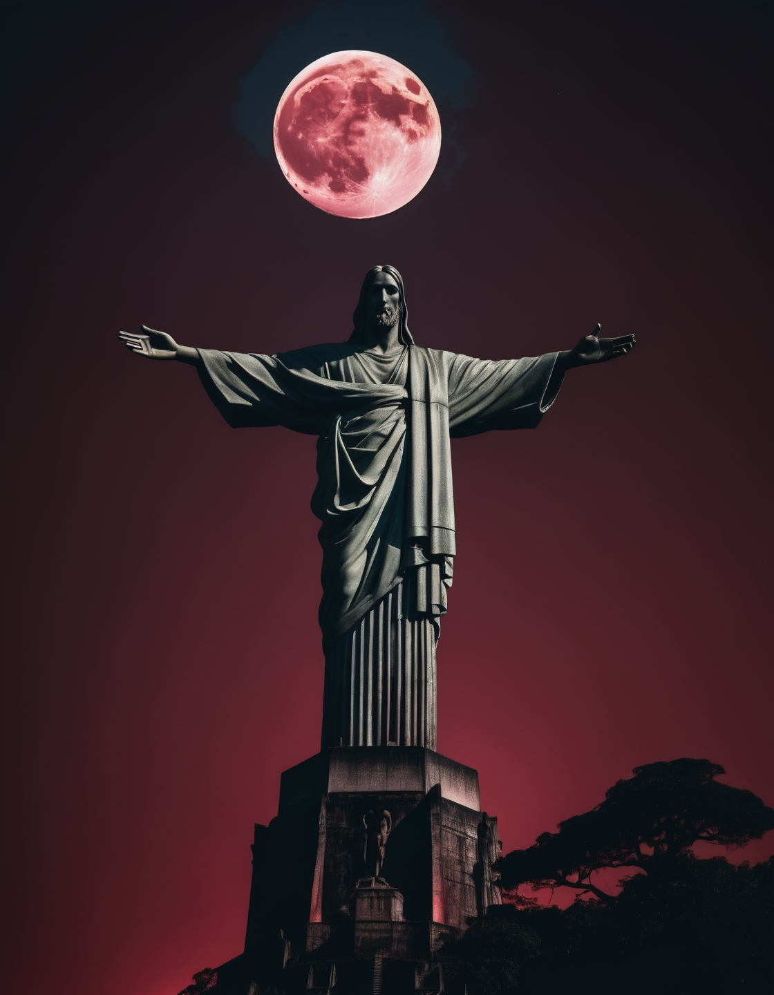 art by Hans von Aachen, landscape of a [Christ the Redeemer|Cologne], Moon in the night, Maroon lighting, 80mm, Unsplash