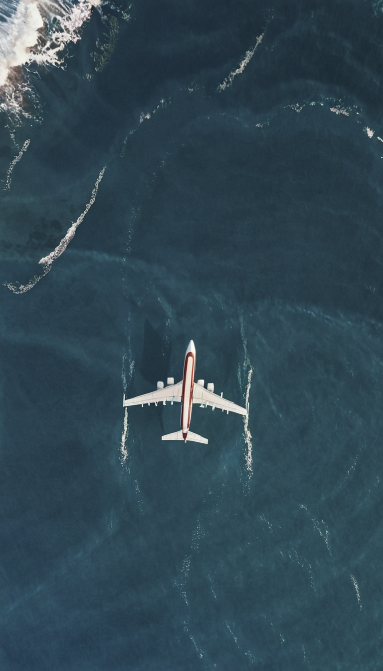 a plane flying over the ocean <lora:DD-above-v1:1> above