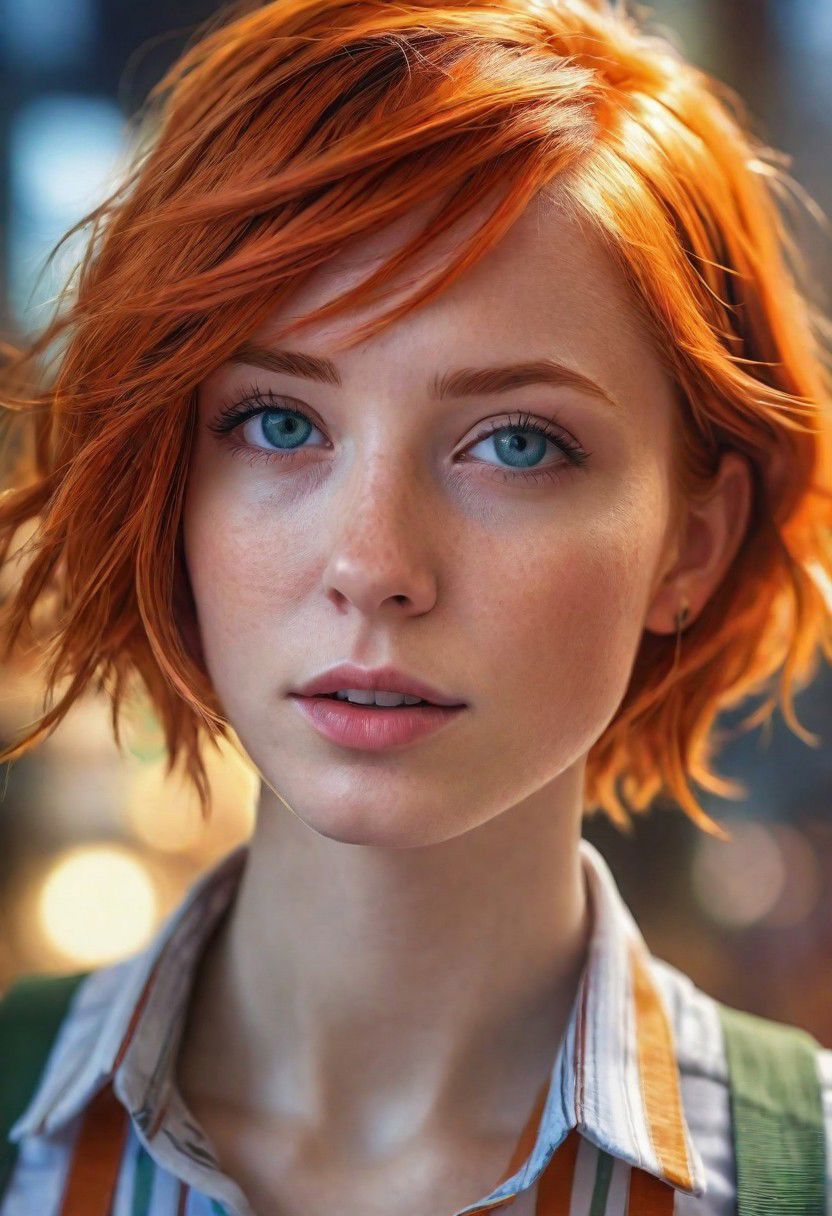 (best quality, masterpiece, beautiful and aesthetic:1.2, colorful, dynamic angle)((Full shot)), (highly detailed illustration), science fiction, extreme detailed, colorful,35mm, bokeh, 9:16, (intricate details, hyperdetailed:1.15), detailed, sunlight passing through hair (high contrast, official art, extreme detailed, highest detailed), <lora:Leeloo_5thElement_MillaJovovich_smf_lora_v2:0.9>, 1girl, l3e1o057h-smf, solo, realistic, shirt, blue eyes, looking at viewer, lips, red hair, parted lips, short hair, upper body, striped shirt, white shirt, suspenders, short sleeves, blurry, nose, bangs, orange hair, indoors, blunt bangs, green eyes, blurry background, portrait <lora:add_detail:0.5>