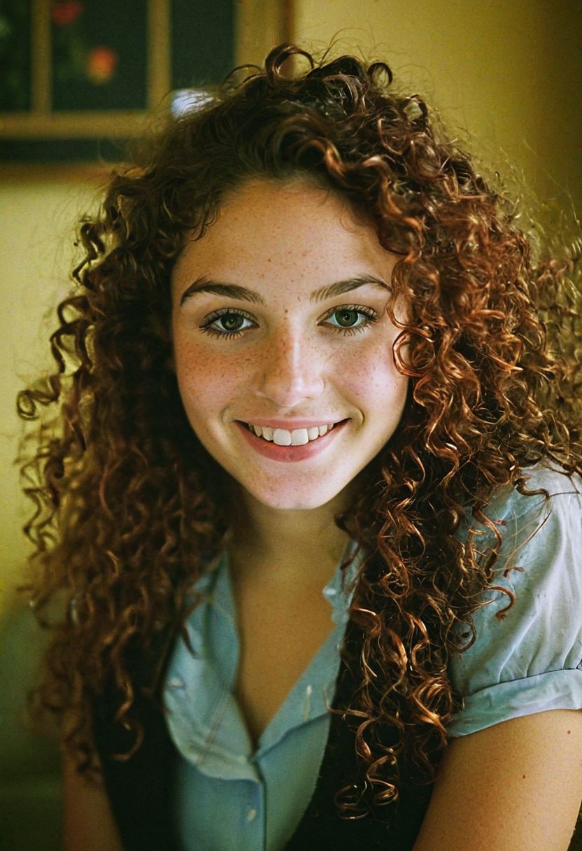 (indistinguishable from reality:1.4), 1girl, a beautiful 25 y.o Montreal, 1996, (detailed facial features), (freckles:0.05), (acne:0.025), beautiful lady, (freckles), big smile, ruby eyes, long curly hair, dark makeup, hyperdetailed photography, soft light, head and shoulders portrait, cover,, Nikon FM2, 35mm SLR, messy apartment room, <lora:MJ52:0.4>