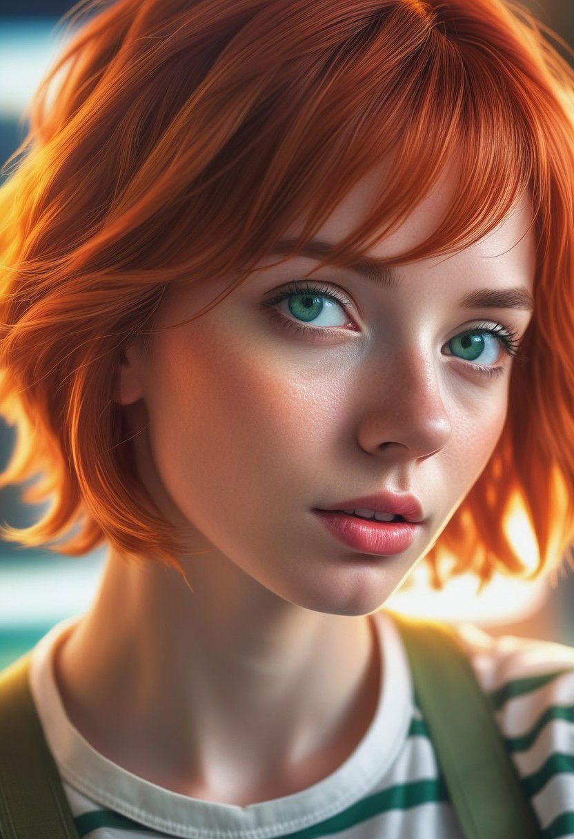 (best quality, masterpiece, beautiful and aesthetic:1.2, colorful, dynamic angle)((Full shot)), (highly detailed illustration), science fiction, extreme detailed, colorful,35mm, bokeh, 9:16, (intricate details, hyperdetailed:1.15), detailed, sunlight passing through hair (high contrast, official art, extreme detailed, highest detailed), <lora:Leeloo_5thElement_MillaJovovich_smf_lora_v2:0.9>, 1girl, l3e1o057h-smf, solo, realistic, shirt, blue eyes, looking at viewer, lips, red hair, parted lips, short hair, upper body, striped shirt, white shirt, suspenders, short sleeves, blurry, nose, bangs, orange hair, indoors, blunt bangs, green eyes, blurry background, portrait <lora:add_detail:0.5>