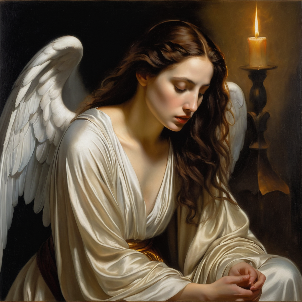 Intimate oil painting,inspired by Caravaggio and El Greco BREAK (Penitent Mary Magdalene:1.3),Kneeling in remorse,Tear-streaked face,(Humble attire:1.2),(Contrite posture:1.2),(Soft glow:1.2) BREAK (Gentle angels:1.3),Gracefully hovering,(Ethereal presence:1.2),(Subtle radiance:1.2),(Seraphic companions:1.3) BREAK Muted surroundings,Sacred atmosphere,(Spiritual introspection:1.2),Executed with masterful strokes,Rich chiaroscuro,Evocative emotion.,