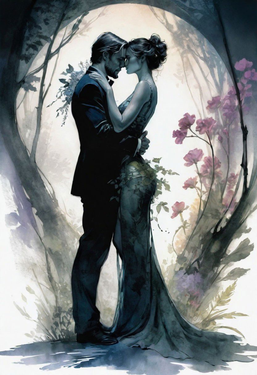 Stunning dark romantic fantasy art double exposure sketch illustration full length portrait silhouette of a beautiful couple passionately hugging. Volumetric and dynamic lighting. A hyper-detailed photorealistic, hyperrealistic, impressionistic, maximalist masterpiece. Screensaver, ink, watercolor, flowers, herbs, flora style of Harrison Fisher, Jean Baptiste Monge, Thomas Kinkade, David Palumbo, Karn Griffiths.