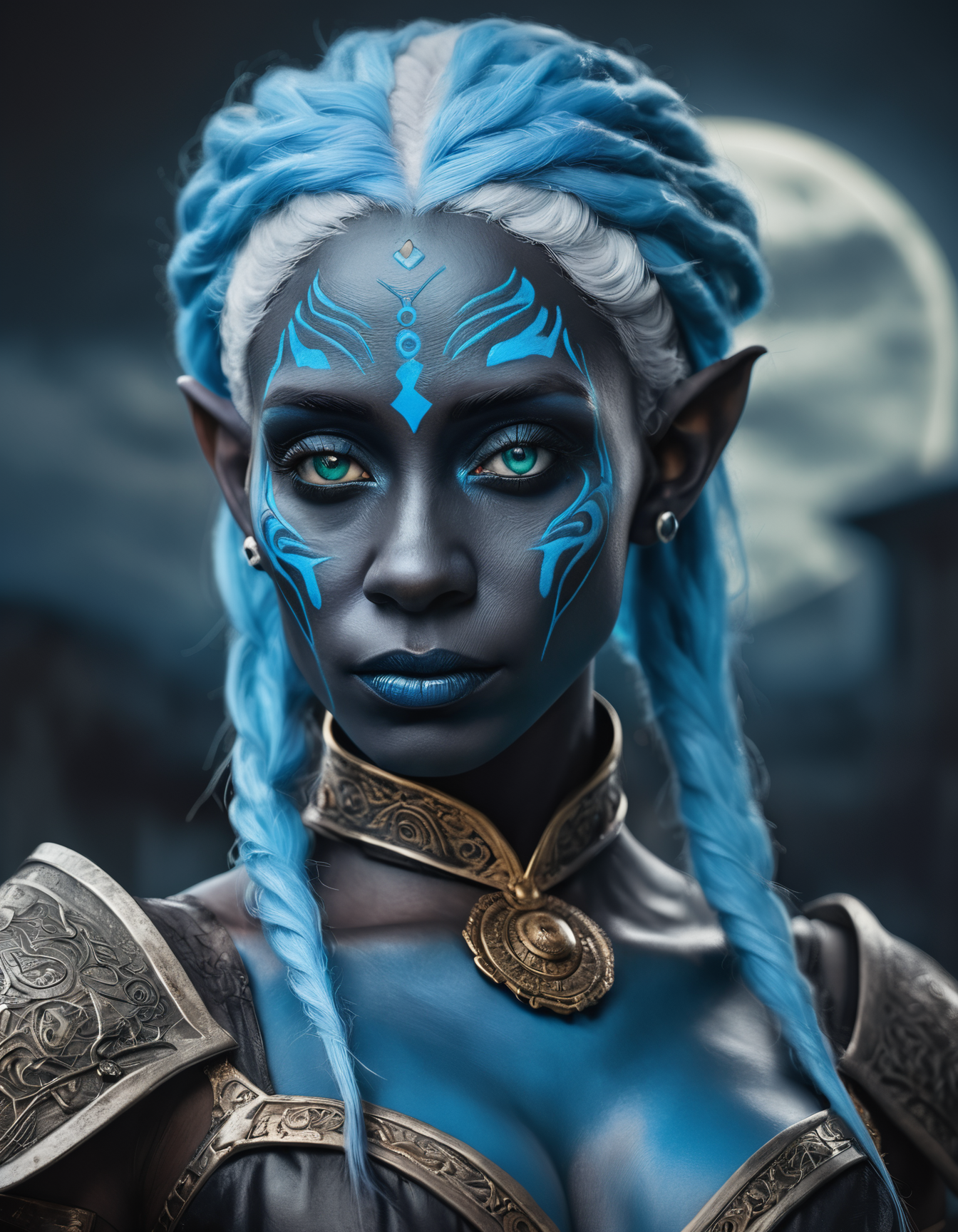 Portrait of Drow with fluorescent blue hair and with Cloudy face, Oxford, perfect composition, hyperrealistic, super detailed, 8k, high quality, trending art, trending on artstation, sharp focus, studio photo, intricate details, highly detailed, by greg rutkowski