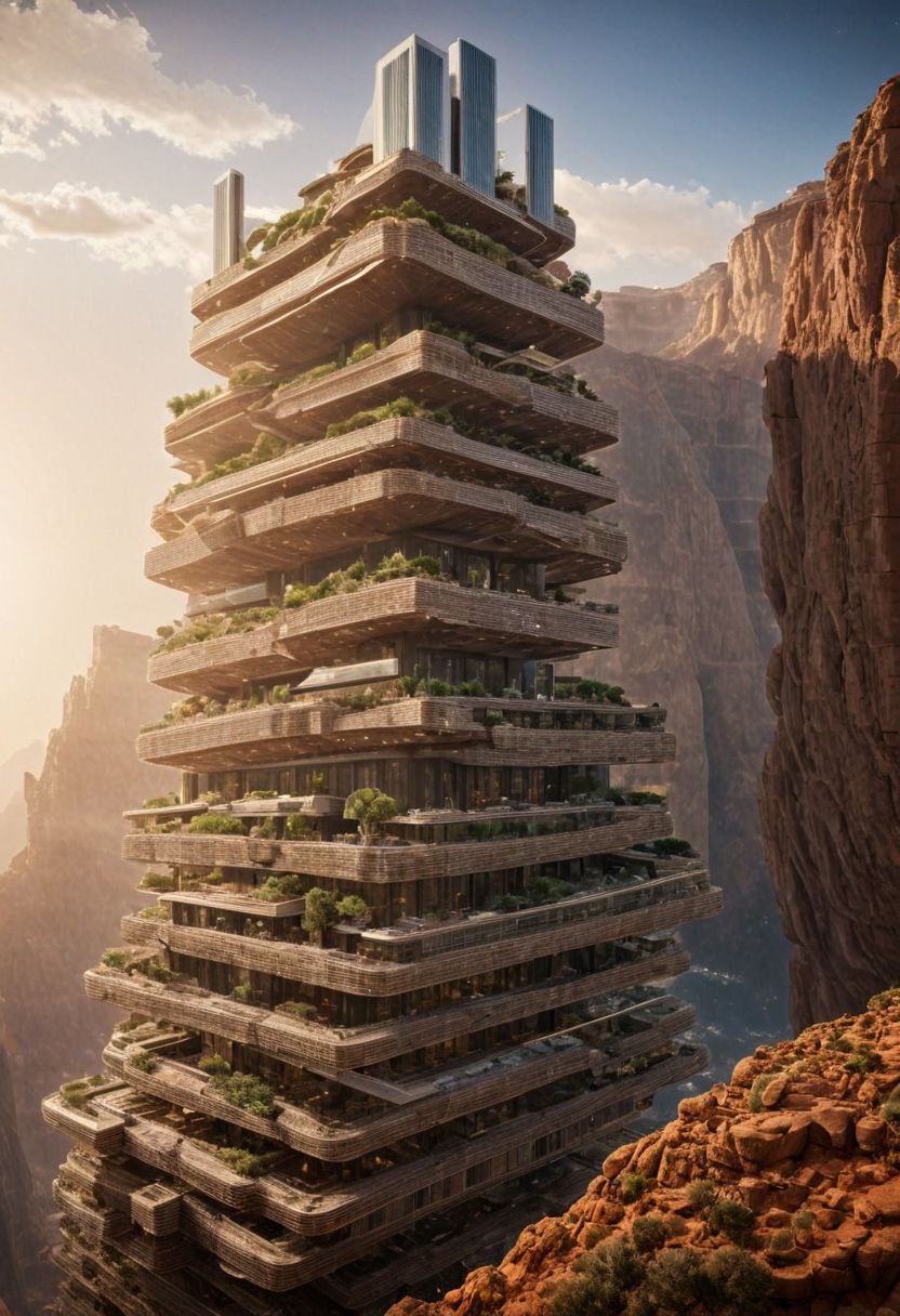 (The colonial city of the future, in the mist-filled Grand Canyon, on an unknown Earth-like planet, 2 moon on sky, Spaceship flight connects colonies:1.3), (Richard Meier:1.2), (Mario Botta:1.3), (avant-garde, future, reality, science fiction, photorealistic), (modern architecture:1.2), (Large Files, Ultra Realistic, 8K, 16k, FHD, HD, VFX, Perfect, Photography, composition, Architecture Sales Photography, Architecture Competition, Ultra High Resolution, Cinematography, High Resolution Image:1.1), (dramatic lighting, direct sunlight, ray tracing, clear shadow:1.2), (real landscape:1.1), (blurred background:1.0), (urban background, more_details) , ac_neg1, great lighting, clear, xtower, industrialbuilding, futureskyline, stacked