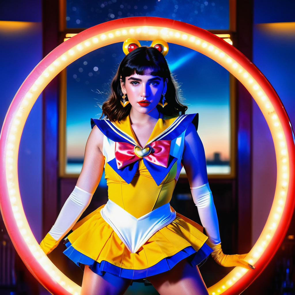 A vibrant photograph of Dua Lipa dressed as sailor moon, sailor senshi uniform, wide-angle lens,wide shot, full body, legs, waist, ((looking at viewer)), (looking into the camera), front view, detailed face, freckles,amber eyes, hyper realistic, natural lightning, perfect shadows, 35mm photograph, film, professional, 8k, highly detailed,from movie, (cleavage:1.2) , high budget, bokeh, cinemascope, moody, epic, gorgeous, cinemascope, moody, <lora:xl_sailor_senshi_uniform-1.0:1>