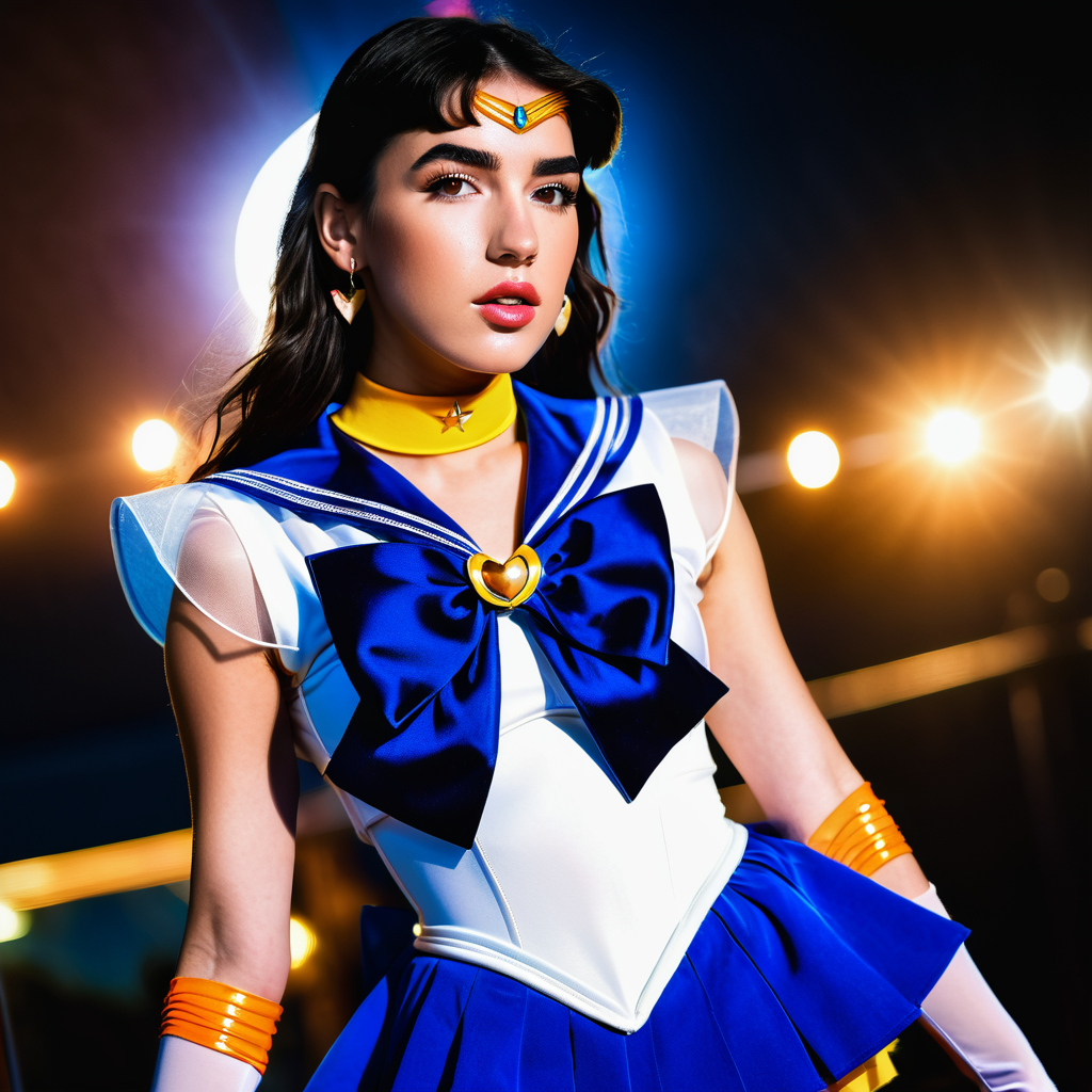 A vibrant photograph of Dua Lipa dressed as sailor moon, sailor senshi uniform, wide-angle lens,wide shot, full body, legs, waist, ((looking at viewer)), (looking into the camera), front view, detailed face, freckles,amber eyes, hyper realistic, natural lightning, perfect shadows, 35mm photograph, film, professional, 8k, highly detailed,from movie, (cleavage:1.2) , high budget, bokeh, cinemascope, moody, epic, gorgeous, cinemascope, moody, <lora:xl_sailor_senshi_uniform-1.0:1>