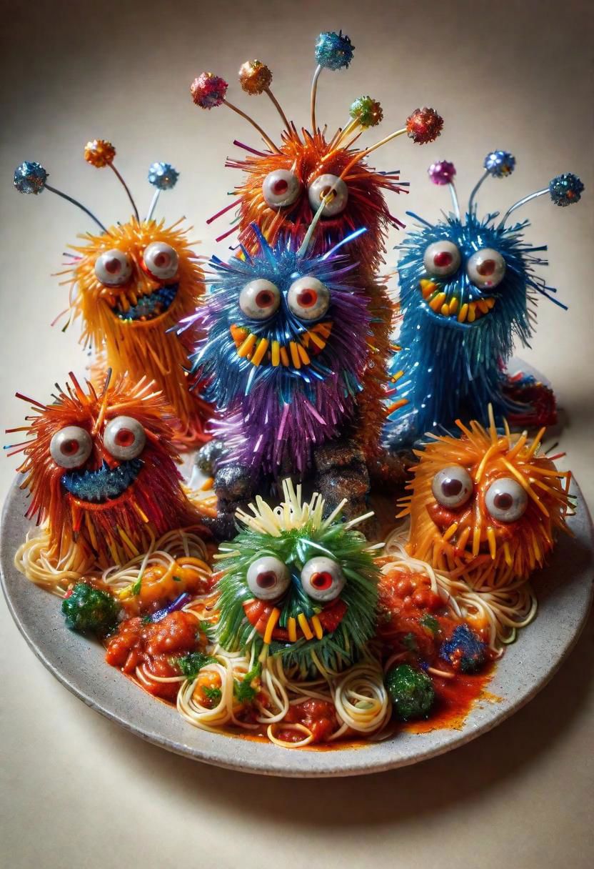 [Red, orange, yellow, green, blue, indigo, violet] scary noodle monster spaghetti horde made of ral-tinsel, bloody macaroni meatballs mini monsters tomato sauce caos bolognese made of ral-tinsel