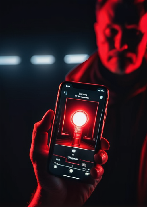 a person holding a cell phone in their hands with red light on them and a black background with a red light on the phone, Cedric Seaut (Keos Masons), anamorphic lens flare, a character portrait, cobra