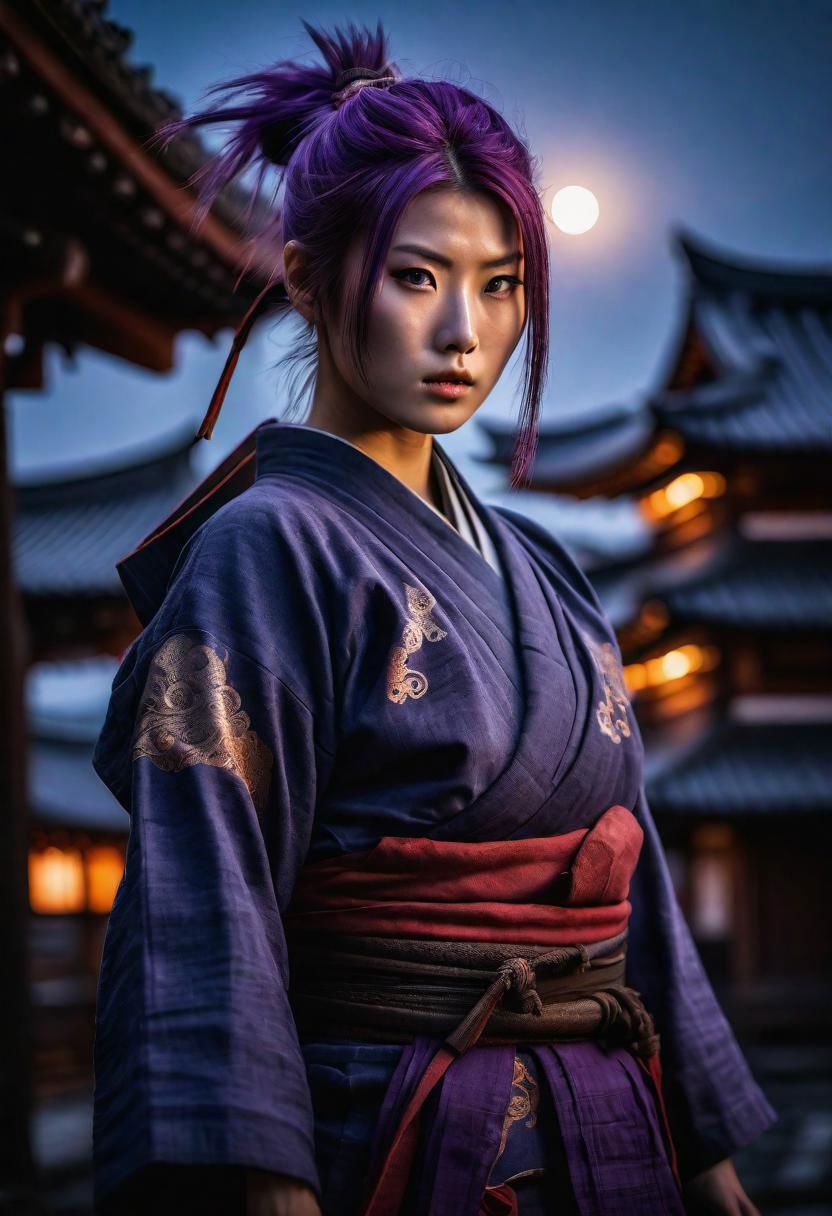20yo Female ninja (Sekiro), purple hair, big breast, wearing sexy ninja dress, detailed eyes, on the roof of a Japanese temple, full moon at his back, (cinematic lighting:1.3), full body, Fujifilm XT3,(sharpen light:1.2),(intricate shadows:1.3),((heroic:1.6)),cinematic shot,perfect eyes, Canon RF85mm f/1.2, masterpiece ,best quality,ultra high resolution,cinematic lighting,reflections,HDR,8K resolution,