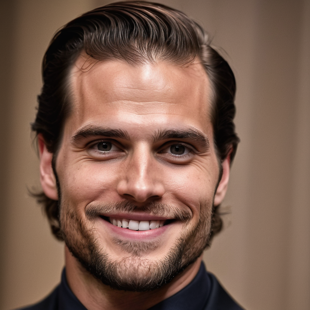photograph of charming man, slicked-back sandy brown hair, stubble beard, steel gray eyes, confidently smiling, tailored black suit, presenting at a corporate conference, [[realistic skin, imperfections, close up]], intricate, (Henry Cavill:0.6)