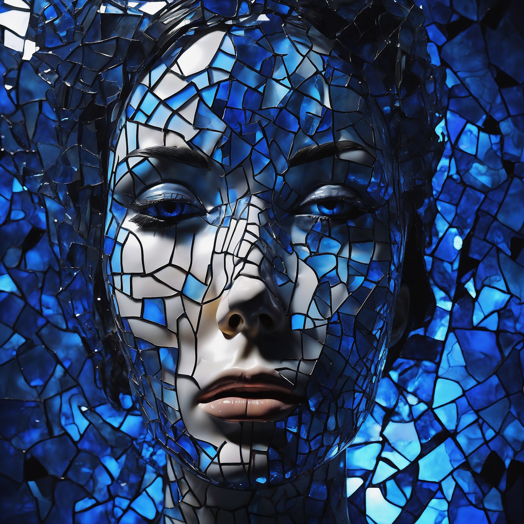 An abstract representation of a woman's face, her skin is made of Made_of_pieces_broken_glass, transparent, glowing dark blue from the inside, breaking through a wall of glass, background is darkness, (dimly lit:1.2), focusing on her vivid eyes