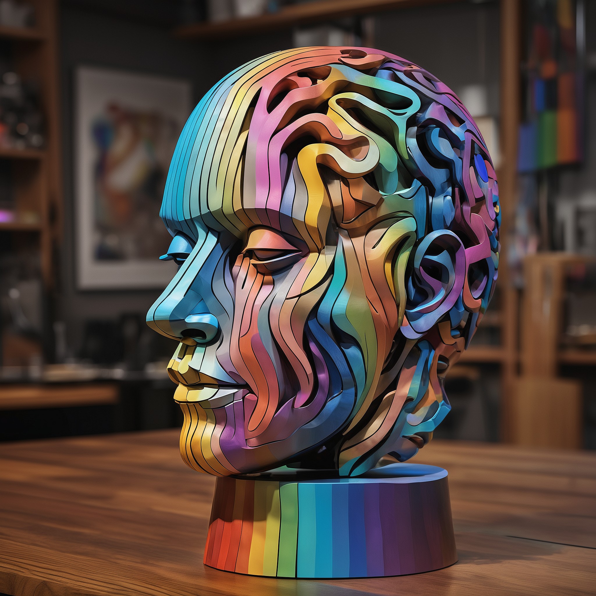 large multi colour (human head) sculpture on table, in the style of sketchfab, color gradients, collecting and modes of display, metallic rotation, craftcore, (wood:1.3), spiral group, background is black