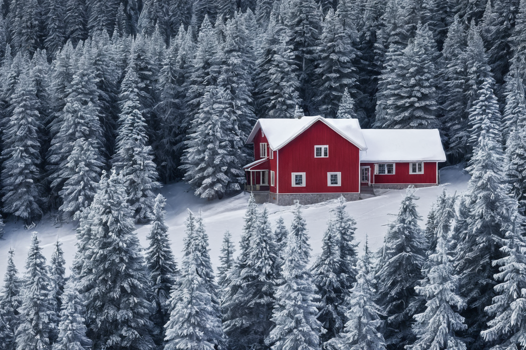 A lone red house nestled on the left side of the image, surrounded by a dense grove of frosty evergreens