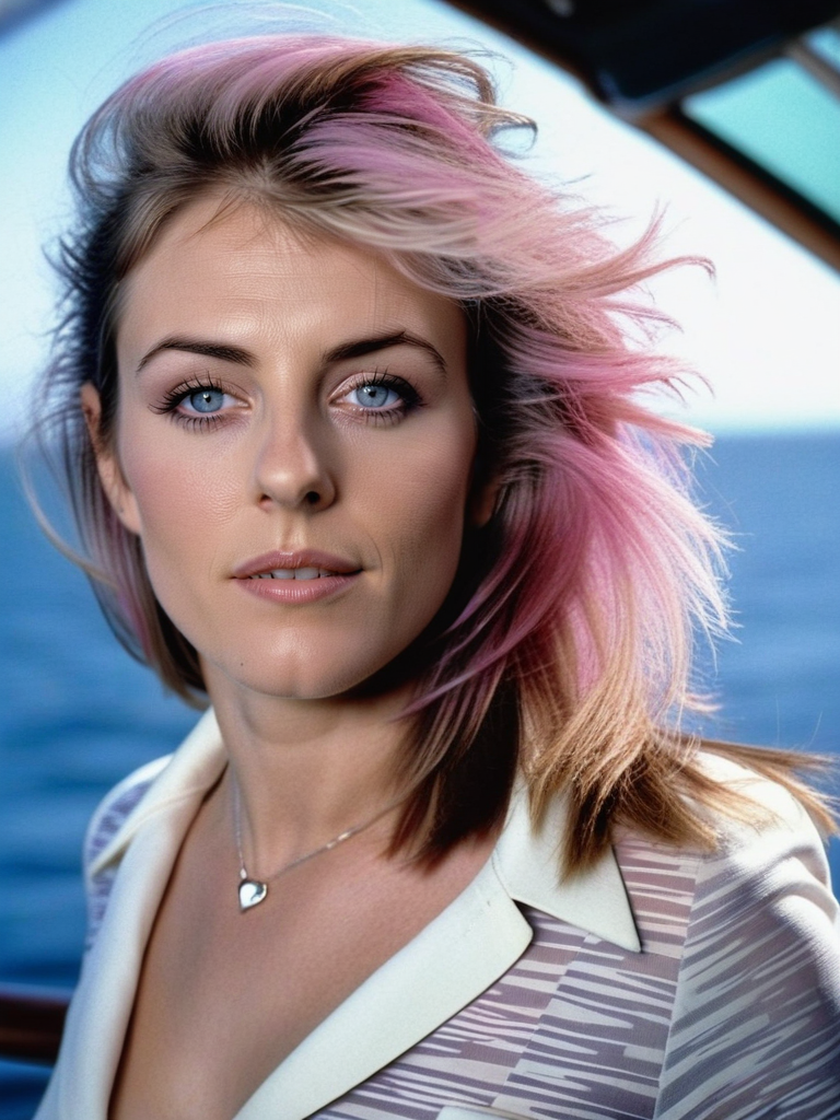 professional portrait photograph of a beautiful, elizabethhurley, <lora:elizabethhurley_sdxl:0.8> with (long pink hair), (wearing a long sleeve shirt:1.2), (looking up in a yacht:1.2), summer <lora:DetailedEyes_V3:0.8> (pores:0.5) (freckles:0.2)