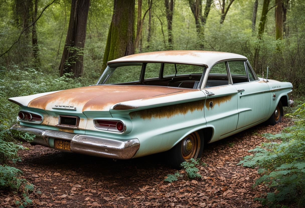 (high res photography, UHD,8k), funny bizarre weird 1960 Plymouth Belvedere, design concept style, two-tone paintjob, background abandoned overgrown Art Deco cinema,