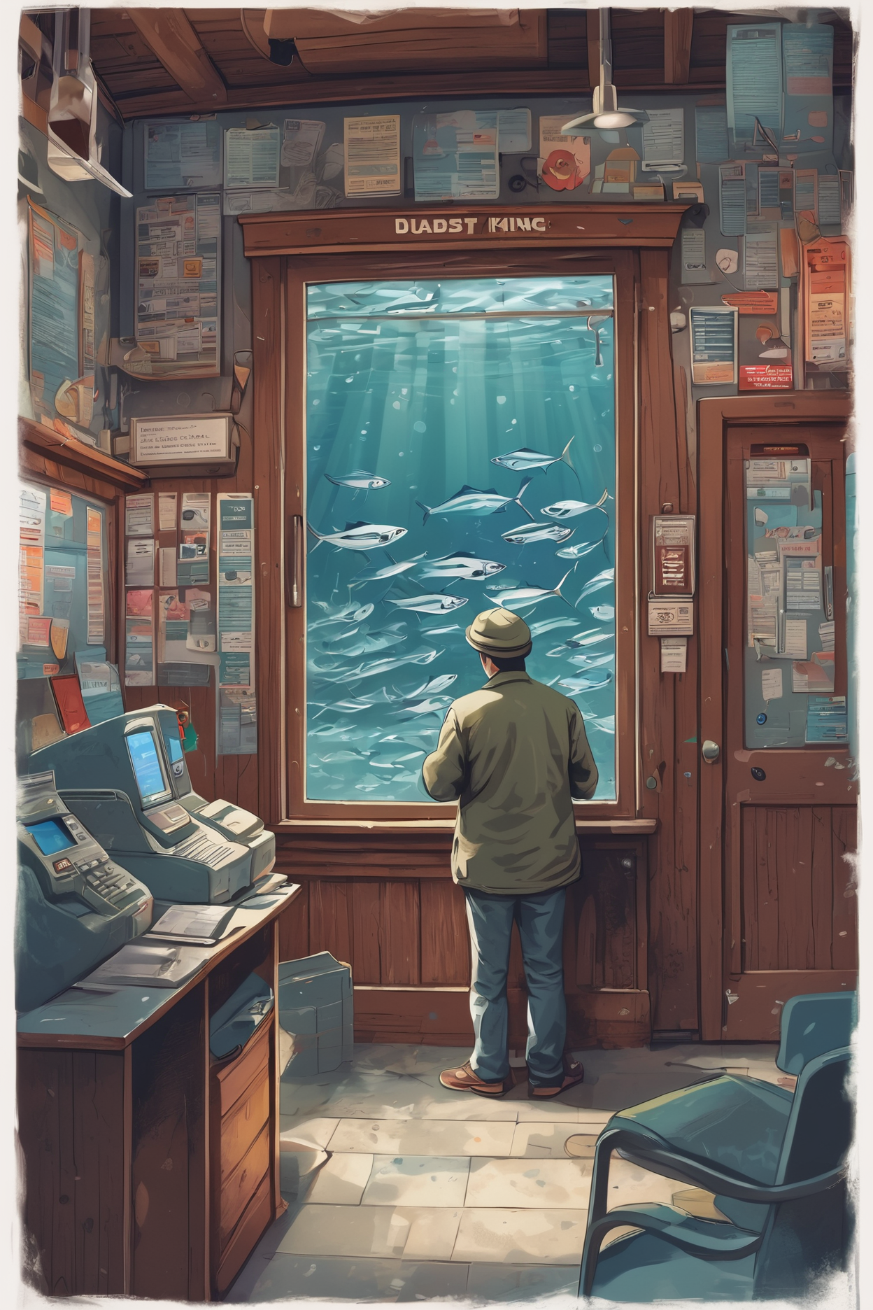 [art by Harvey Kurtzman,art by Martin Grelle::17], Vector Art, Kawaii Kingfish, from inside of a Narrow Post office, Lightcore, poster art