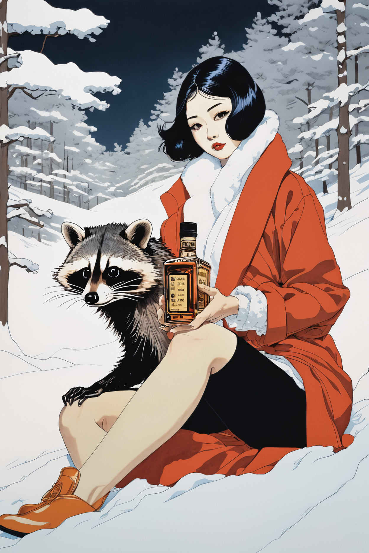 (art by Ikenaga Yasunari:1.2) , (art by Helmut Newton:1.3) , Literal Raccoon, Winter, Cel shaded, Animecore, otherworldly, "I got my ticket for the long way 'round, two bottle whiskey for the way."