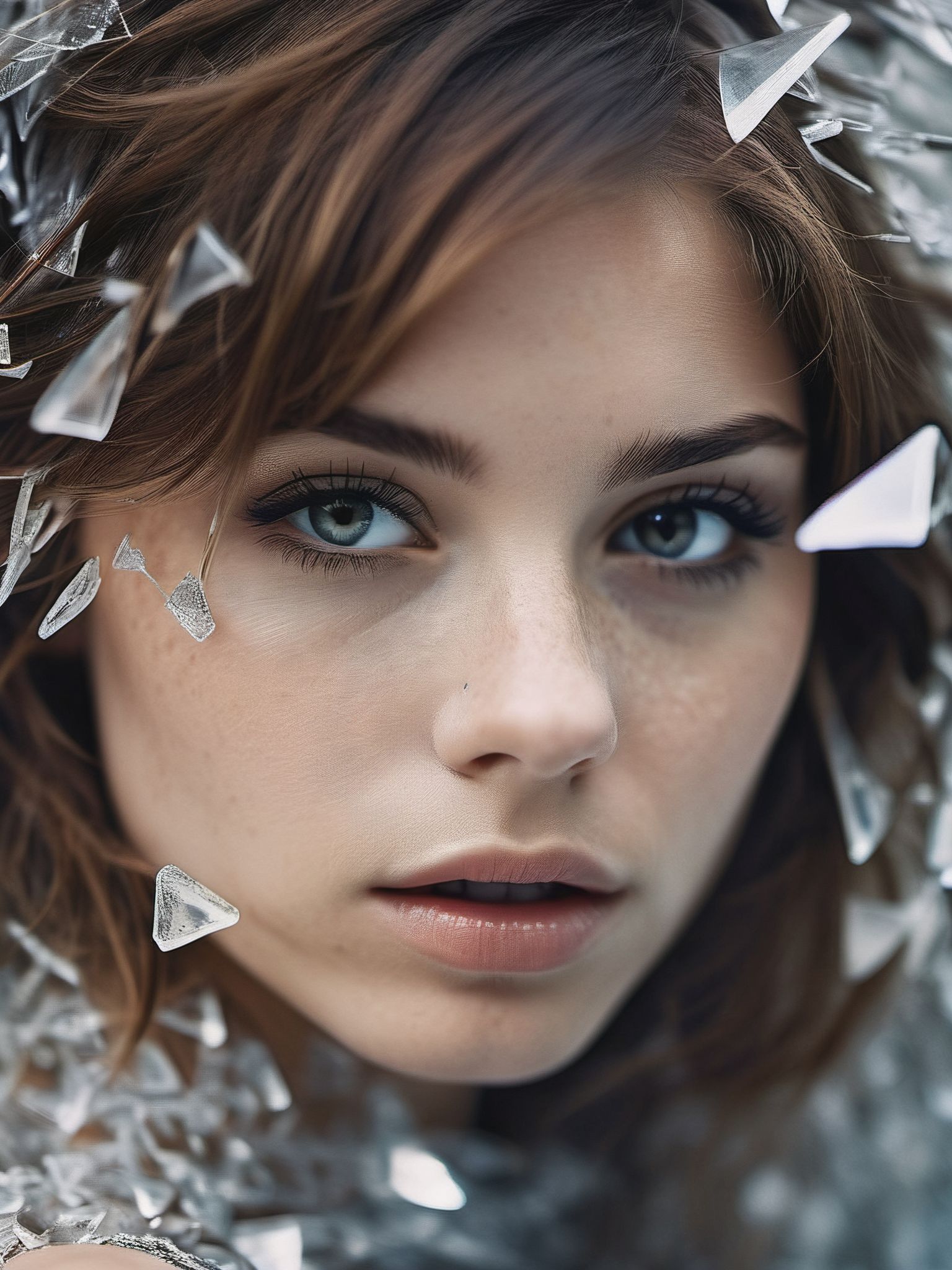 space fragmentation, reghotion, messy hair, serious, glowing hand, surreal, upper body, dynamic pose, Travel through time and space, silver white theme, ultra highres, sharpness texture, High detail RAW Photo, detailed face, shallow depth of field, (realistic skin texture:1.2), (freckles, moles:0.6), dslr, film grain, Fujifilm XT3,