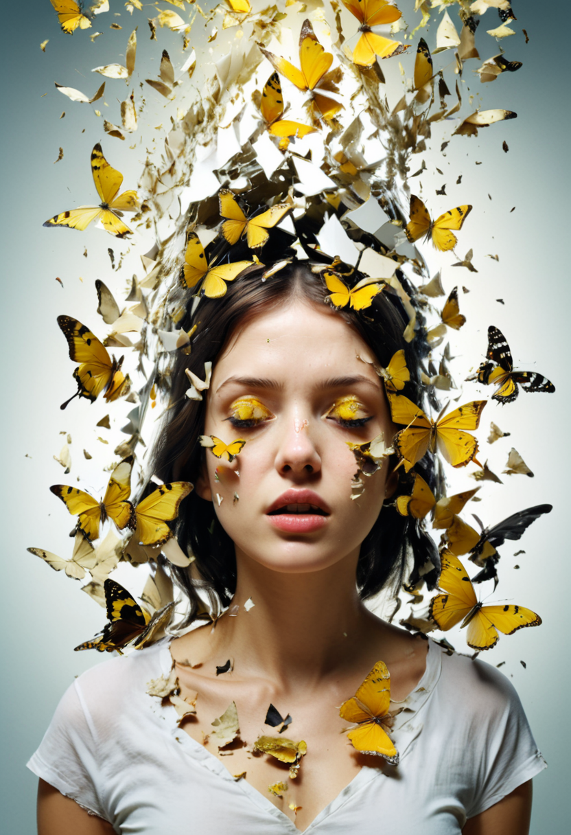 split composition, torn, many yellow butterflies, broken, woman, fragments, nature background, light and shadow, 8k, High detailed, One Hundred Years of Solitude,<lora:xl_more_art-full_v1:0.8> <lora:sdxl_watertexiaoSDXL:1>