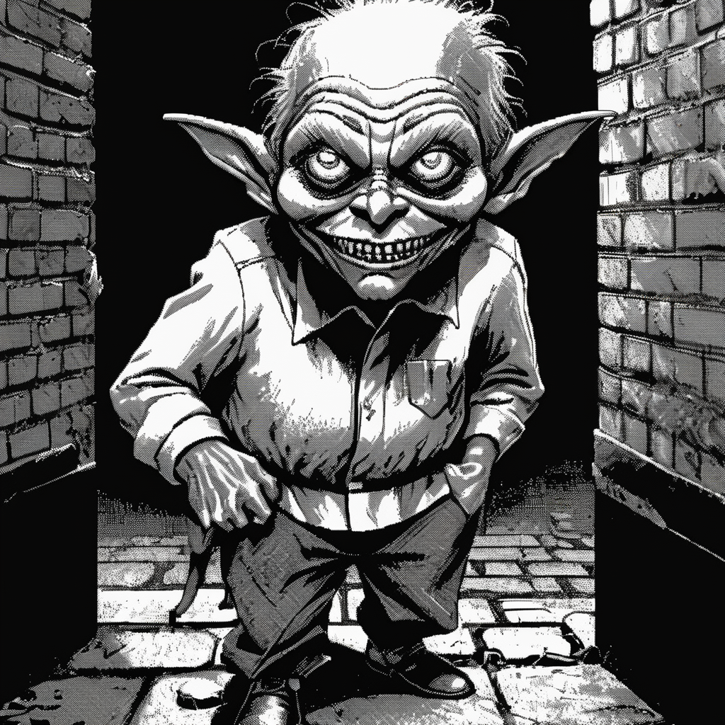 <lora:Macpaint-XL-000015:1>, Macpaint, a black and white pixel image of a creepy goblin up to no good in a dark alley with brick walls and trash, film noir, pixel art, best quality, 80s, masterpiece, dithering