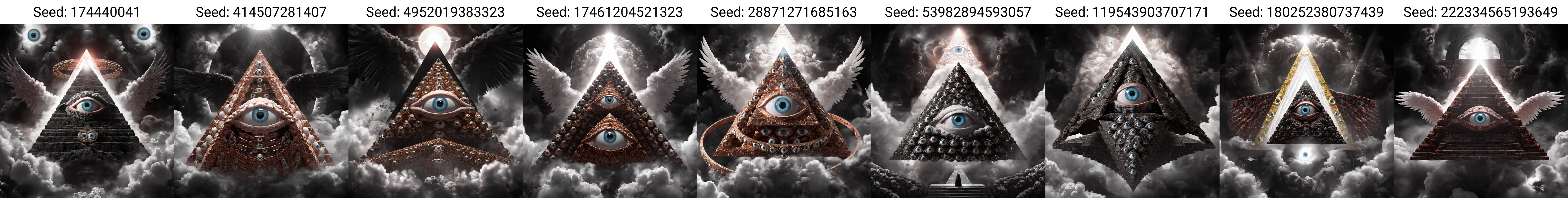 seraphins, a mystical creature with hundreds of eyes and wings with the shape of a pyramid, surrounded by 2 layers of rings full of eyes, eerie, horror, background angelic clouds, sunlight <lora:Seraphins1.0-000038:0.8>