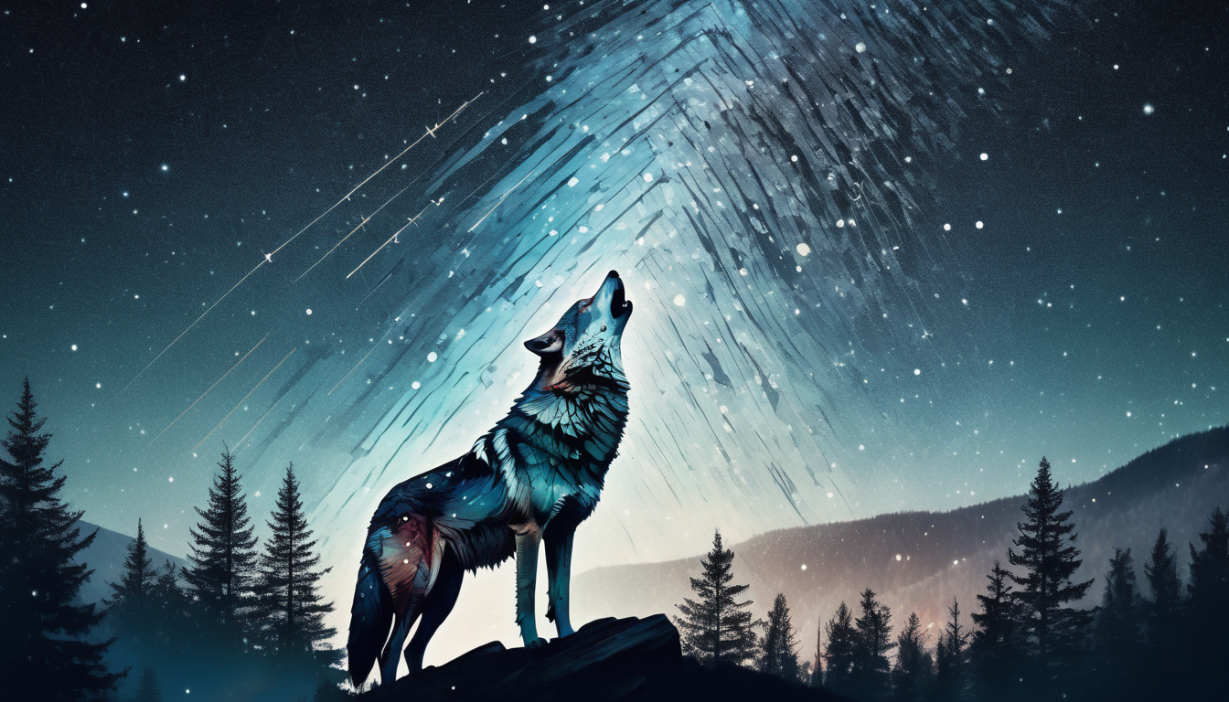 surreal double exposure portrait of a beautiful howling wolve in dark mountain forest scenery against star trail starry night, by Dave White, Conrad Roset, Brandon Kidwell, Andreas Lie, Dan Mountford, Agnes Cecile, triadic colours, thick opaque strokes, accurate depth of field, hyper detailed, whimsical, dynamic, dreamy masterwork