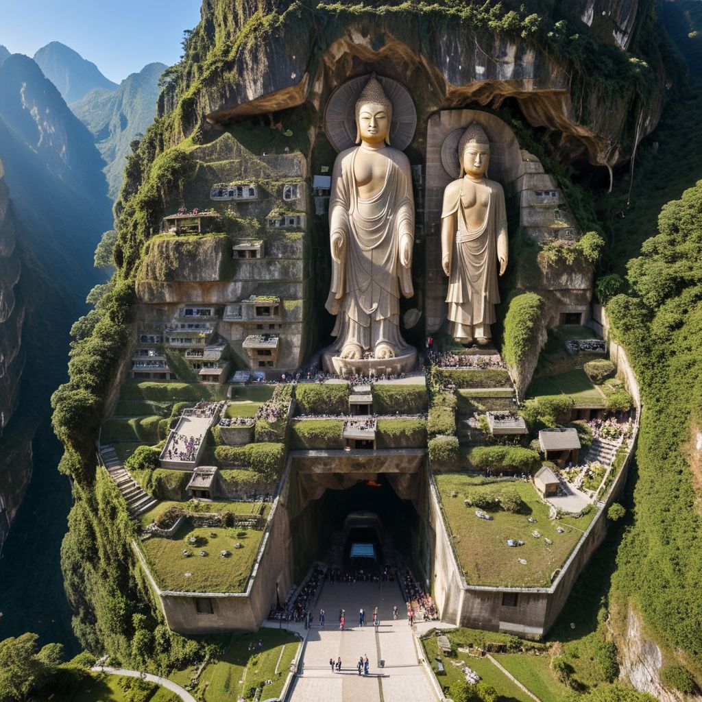 post modern:1.5, (Huge jaint lying down Buddha After sleeping for three thousand years, it emerged from the cliff, In the African wilderness, wild animals were alarmed:1.4), (Ancient megalithic civilization, Azka Lines, on Easter Island, Angkor Wat:1.2), (The colonial city of the future, in the mist-filled Grand Canyon, on an unknown Earth-like planet, 2 moon on sky, Spaceship flight connects colonies, waterfulls:1.3), (Machu Picchu, a mountain settlement, incredibly spectacular:1.2), (Mario Botta:1.3), (avant-garde, future, reality, science fiction, photorealistic), (modern architecture:1.2), White limestone with black granite, fountain, waterfall, landmark, square, path, narrow street, (Large Files, Ultra Realistic, 8K, 16k, FHD, HD, VFX, Perfect, Photography, composition, Architecture Sales Photography, Architecture Competition, Ultra High Resolution, Cinematography, High Resolution Image:1.1), (dramatic lighting, direct sunlight, ray tracing, clear shadow:1.2), (real landscape:1.1), (blurred background:1.0), (urban background, more_details) , great lighting, extremely detailed, clear, tunnel, Buddha Statue, GuanYin Statue, DiZang Statue