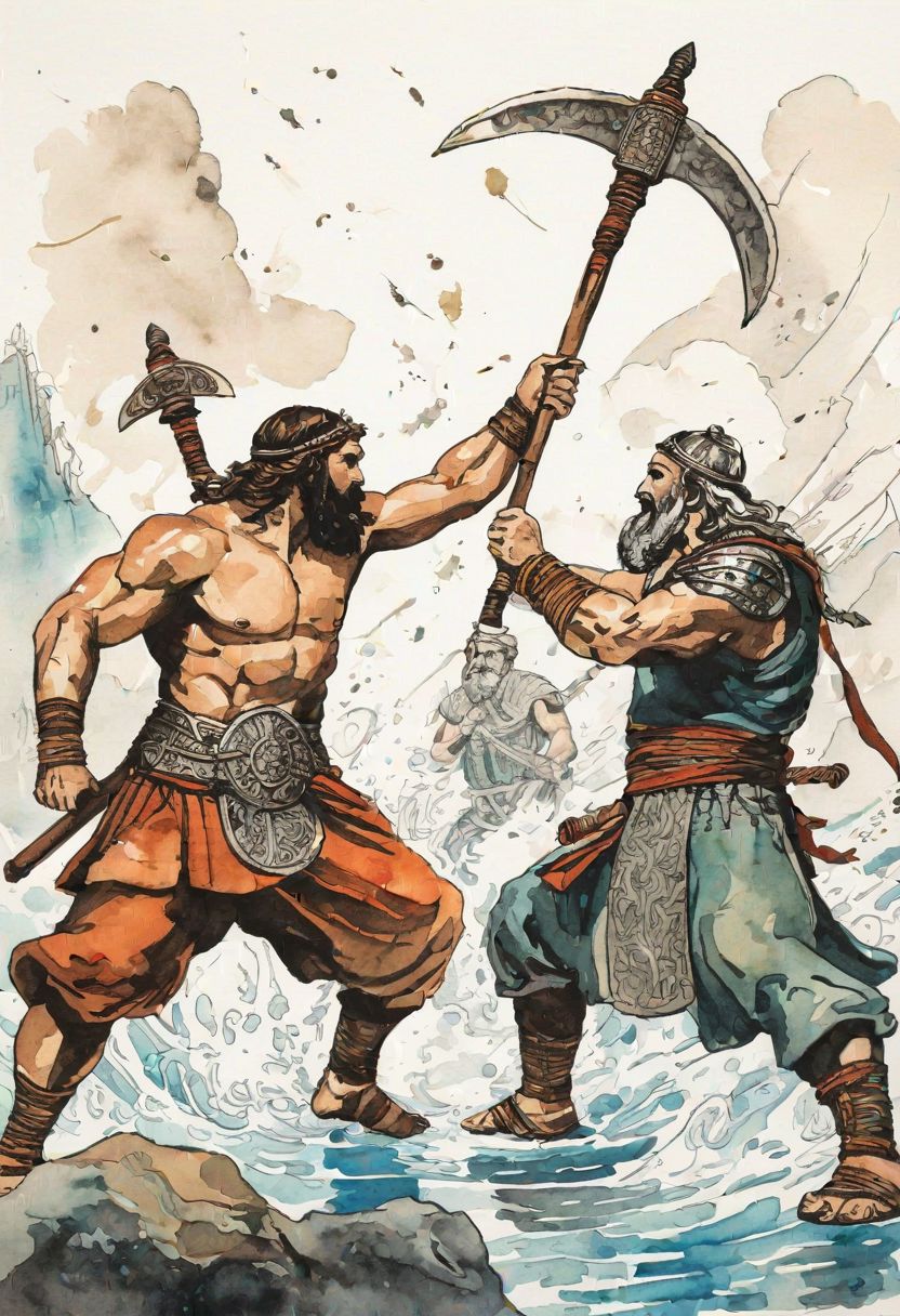 a illustration,ancient times,two giant,fighting,mucular,one swinging a battle-axe,another swings a sword,ink painting,water color,sketch,bold lines,monocolor,astonished details,the third rule of composition <lora:ral-drptpl:1> ral-drptpl