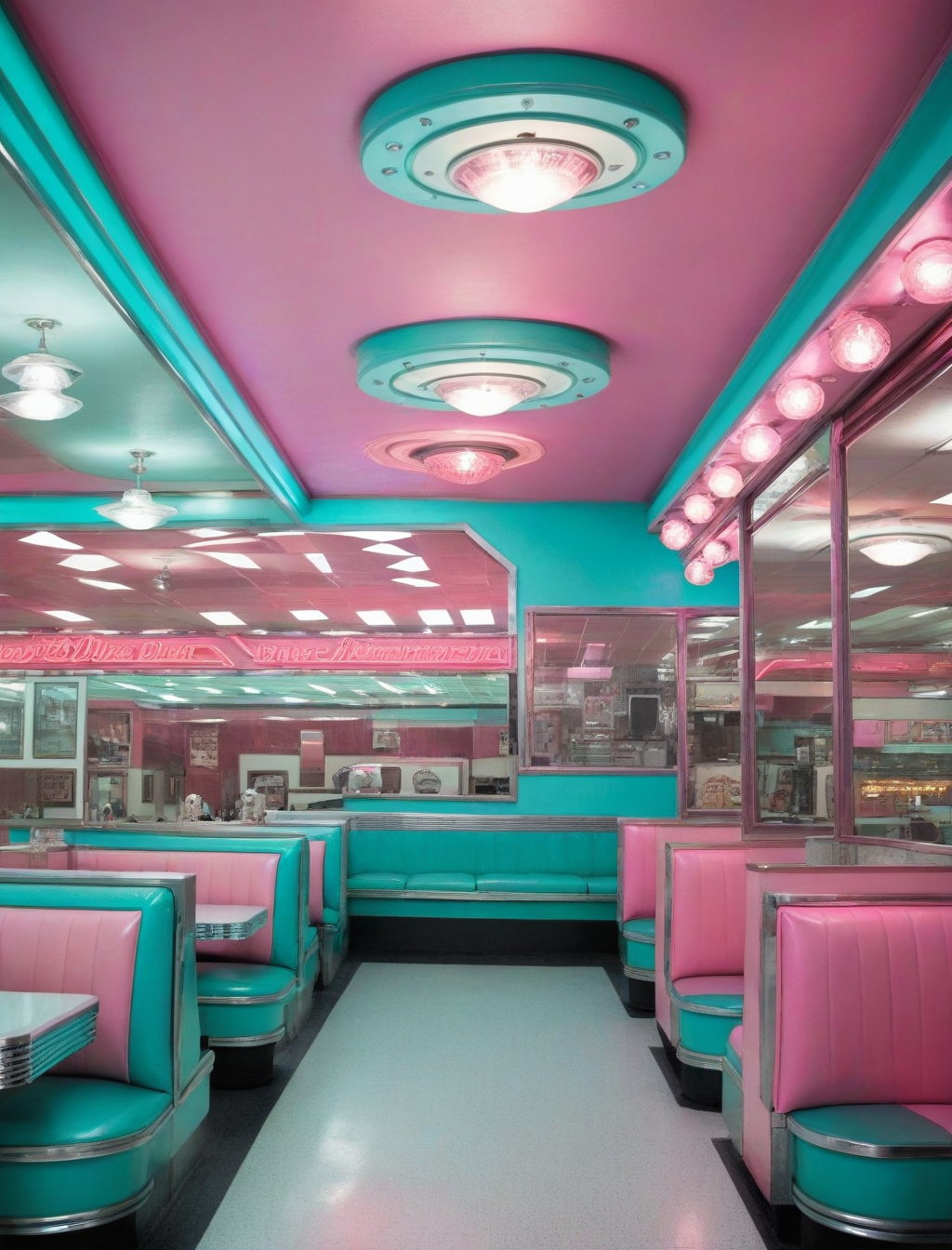 colorful metamodern 50s diner, teal and pink colors <lora:Freddy_Mamani_Silvestre_Architecture_XL:1>