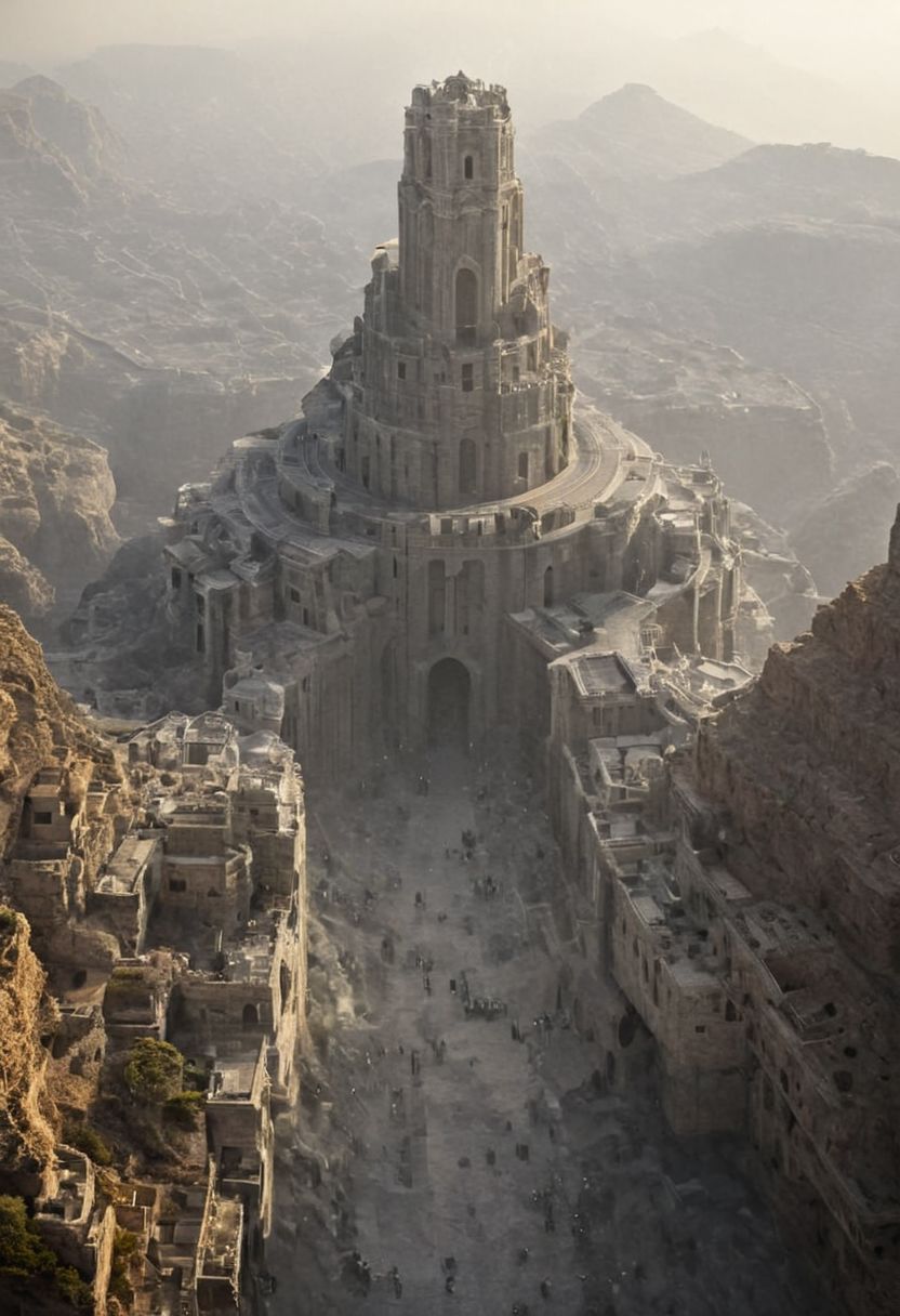 POV view , DOF, (Ancient civilization, Alien Prometheus movie scene, dune movie scene:1.5), (The colonial city of the future, in the mist-filled Grand Canyon, on an unknown Earth-like planet, 2 moon on sky, Spaceship flight connects colonies, waterfulls:1.3), (Machu Picchu, a mountain settlement, incredibly spectacular:1.2), (Mario Botta:1.3), (avant-garde, future, reality, science fiction, photorealistic), (modern architecture:1.2), White limestone with black granite, fountain, waterfall, landmark, square, path, narrow street, (Large Files, Ultra Realistic, 8K, 16k, FHD, HD, VFX, Perfect, Photography, composition, Architecture Sales Photography, Architecture Competition, Ultra High Resolution, Cinematography, High Resolution Image:1.1), (dramatic lighting, direct sunlight, ray tracing, clear shadow:1.2), (real landscape:1.1), (blurred background:1.0), (urban background, more_details) , great lighting, clear, hillscastel, <stardeaf-cold-arc>, xtower, industrialbuilding