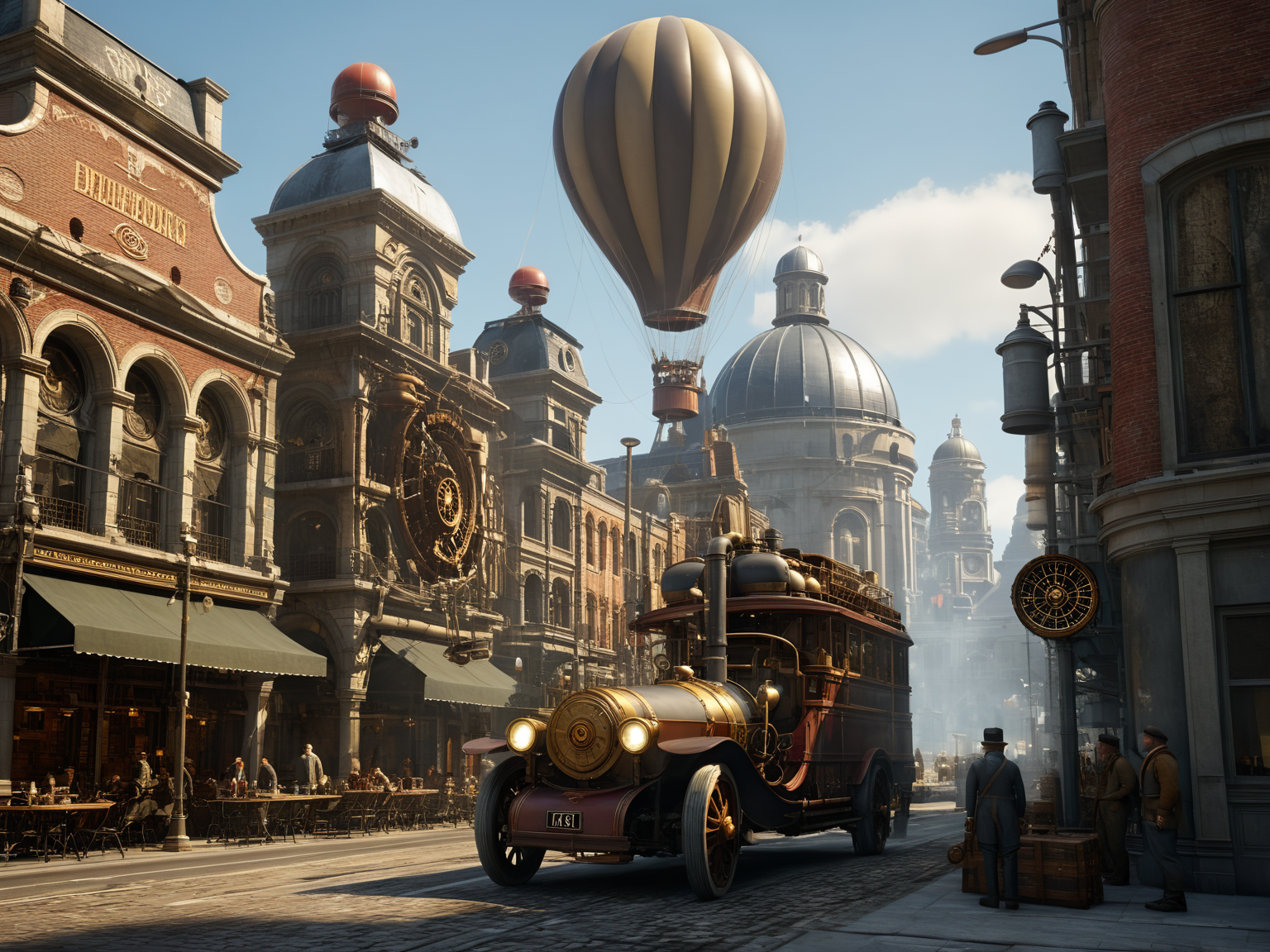 <lora:JJsSteamPunk_XL:1>, ((SteamPunk)) ((best quality)),((masterpiece)),((realistic)), RAW photo, subject,soft lighting, high quality, outdoors, building, scenery, road, real world location, truck, flag, , sunlight, public blocks,daytime,lively city streets, enough detail, high resolution,super realistic, Photorealistic, highly detailed, clock, steam, plane, car, baloon,