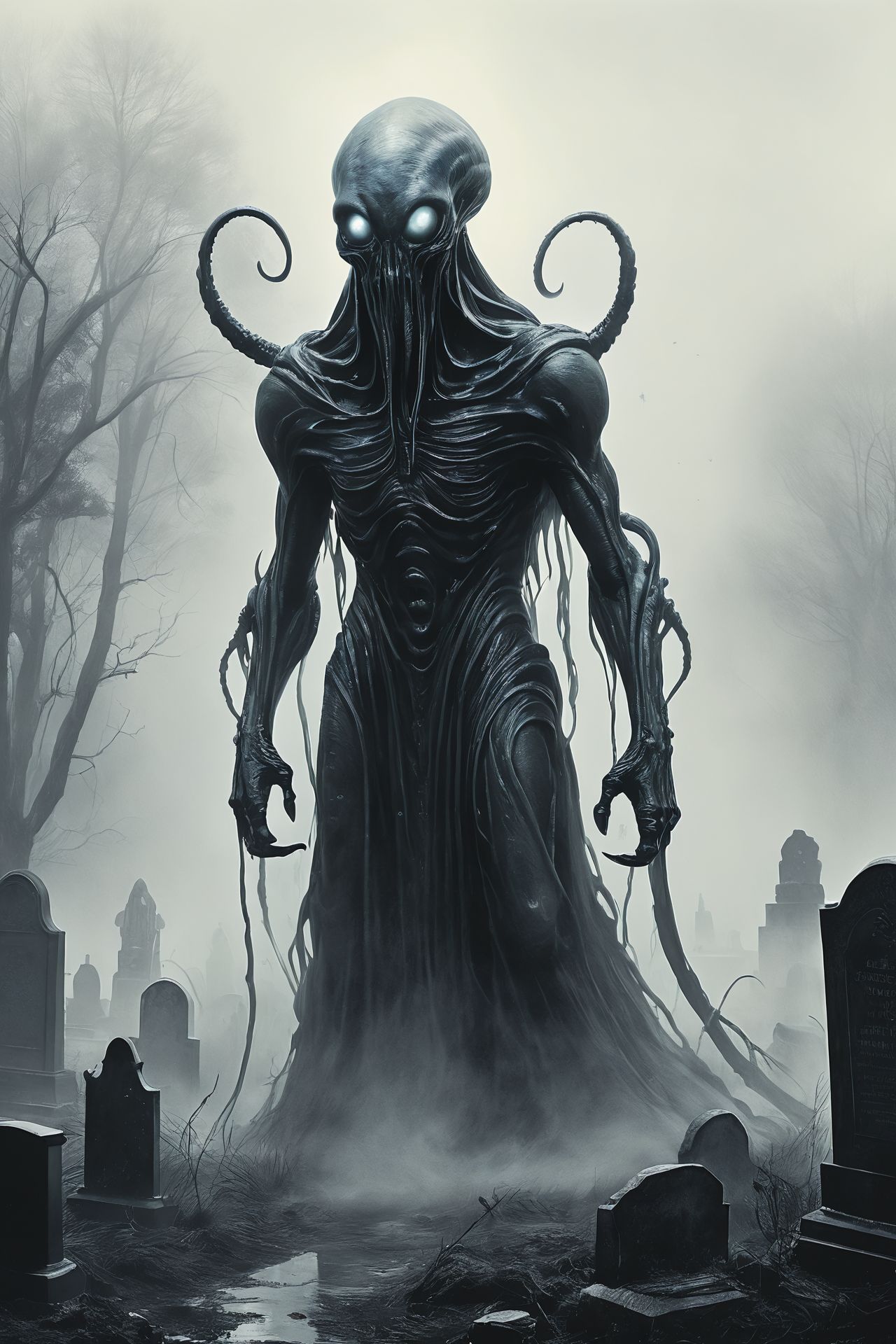 ink wash painting of gigantic eldritch-alien in a graveyard, heavy fog . monochromatic, loose, fluid, expressive, delicate,colorful