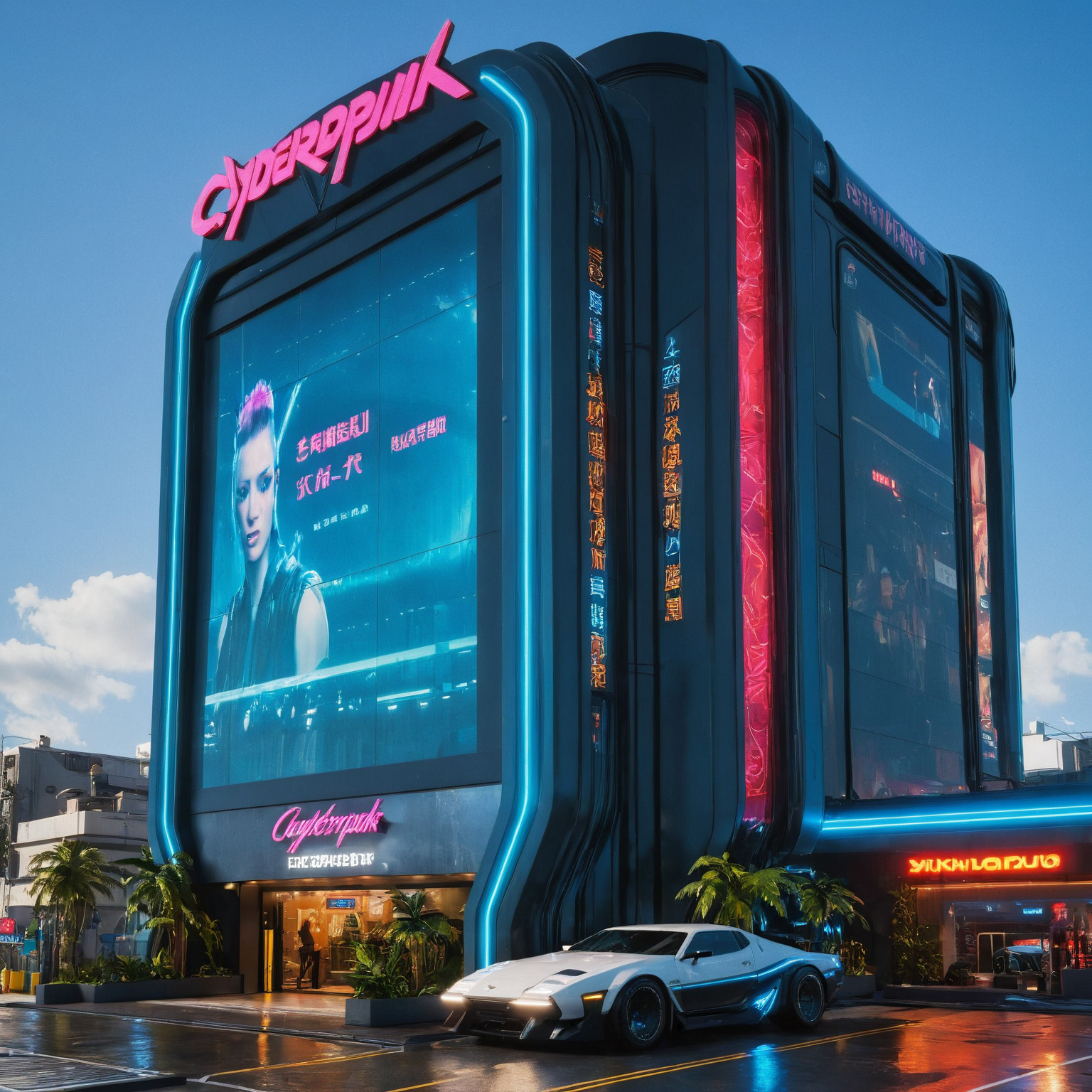 <lora:JJsCyberPunkCity_XL:1>, ((CyberPunk City)), (masterpiece),(high quality), best quality, real,(realistic), super detailed, (full detail),cenery, blue sky, palm, road,car,parking slot,outdoors,day, building,scenery,rain,city,sign,railing,lamppost,neon lights , glass wall , hologram,