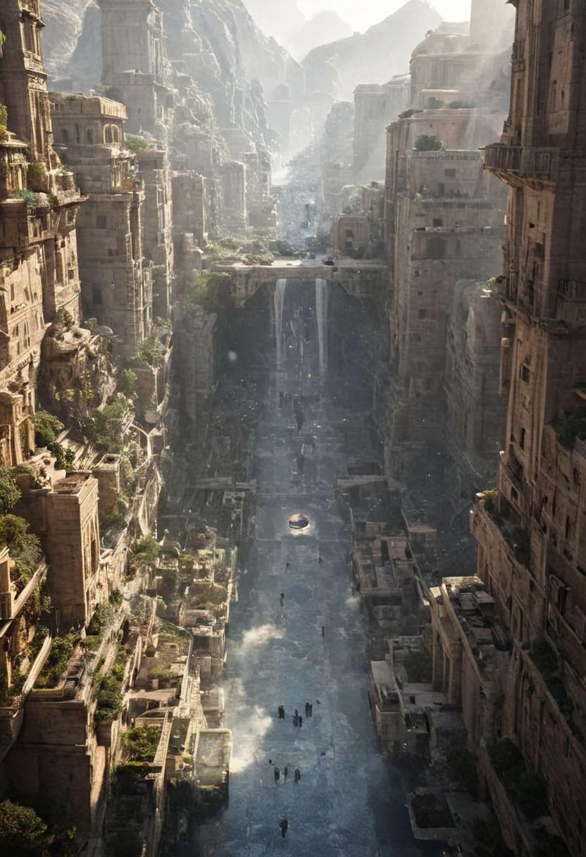 POV view , DOF, (Ancient civilization, Alien Prometheus movie scene, dune movie scene:1.5), (The colonial city of the future, in the mist-filled Grand Canyon, on an unknown Earth-like planet, 2 moon on sky, Spaceship flight connects colonies, waterfulls:1.3), (Machu Picchu, a mountain settlement, incredibly spectacular:1.2), (Mario Botta:1.3), (avant-garde, future, reality, science fiction, photorealistic), (modern architecture:1.2), White limestone with black granite, fountain, waterfall, landmark, square, path, narrow street, (Large Files, Ultra Realistic, 8K, 16k, FHD, HD, VFX, Perfect, Photography, composition, Architecture Sales Photography, Architecture Competition, Ultra High Resolution, Cinematography, High Resolution Image:1.1), (dramatic lighting, direct sunlight, ray tracing, clear shadow:1.2), (real landscape:1.1), (blurred background:1.0), (urban background, more_details) , great lighting, clear, hillscastel, <stardeaf-cold-arc>, xtower, industrialbuilding